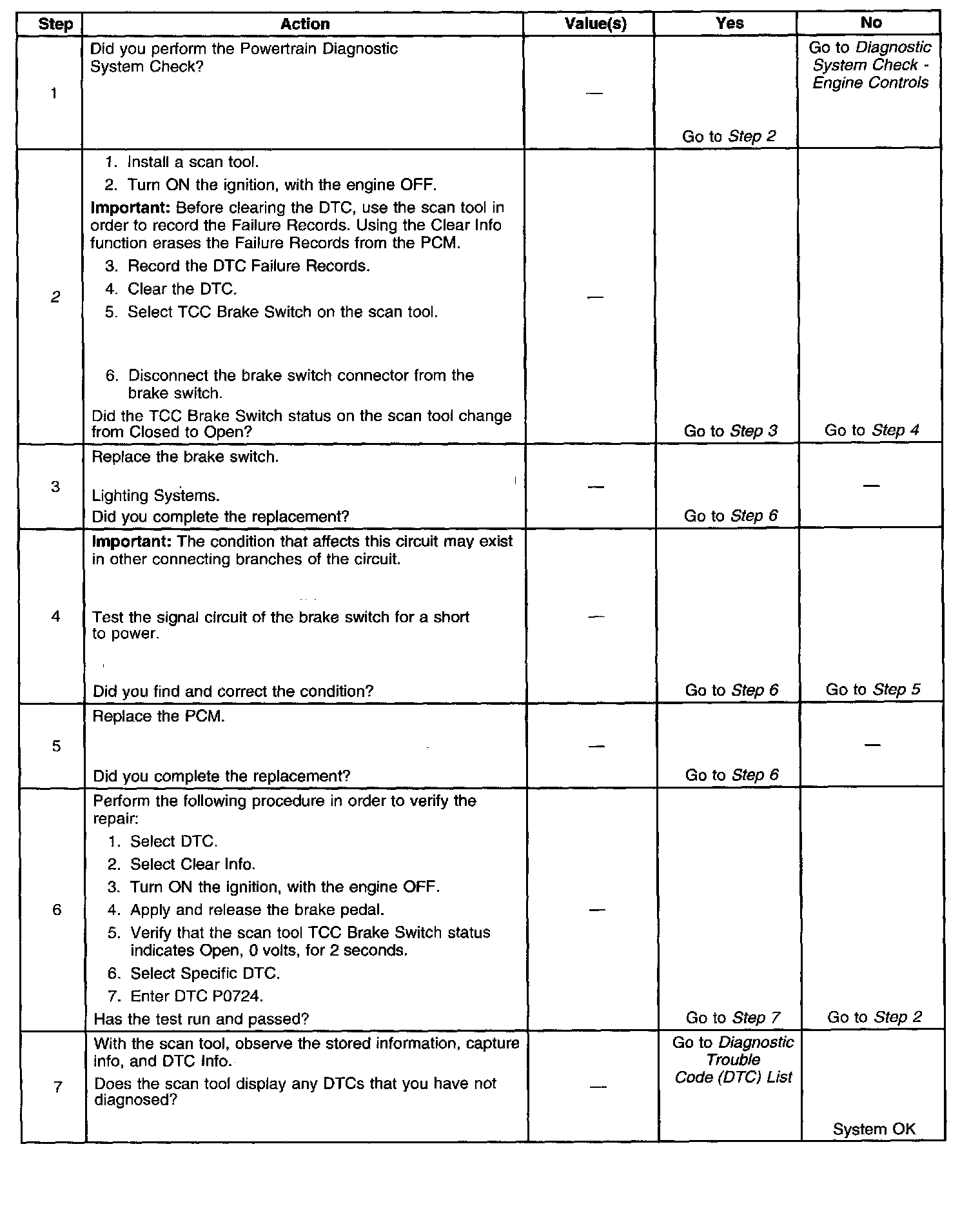 When the PCM detects a closed brake switch circuit, 12 volts, high input, during decelerations, then DTC P0724 sets. DTC P0724 is a type C DTC.