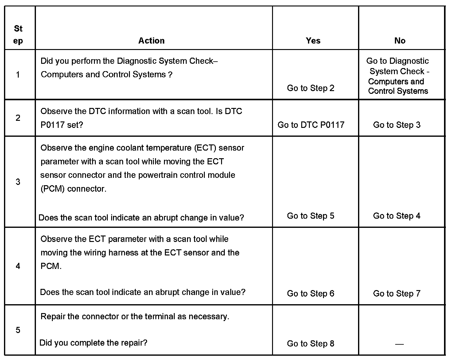 The engine coolant temperature (ECT) sensor is a variable resistor, that measures the temperature of the engine coolant. The powertrain control module (PCM) supplies 5 volts to the ECT signal circuit and a ground for the ECT low reference circuit. When the ECT is cold, the sensor resistance is high. When the ECT increases, the sensor resistance decreases. With high sensor resistance, the PCM detects a high voltage on the ECT signal circuit. With lower sensor resistance, the PCM detects a lower voltage on the ECT signal circuit. If the PCM detects an excessively low ECT signal voltage, which is a high temperature indication, DTC P1114 sets.
