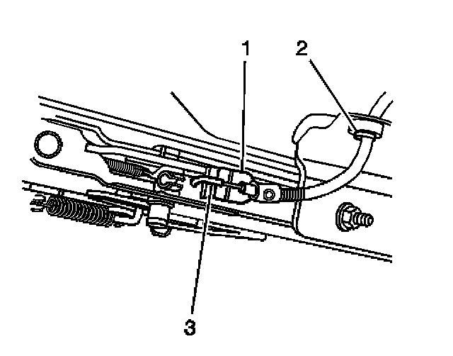 1. Install the cable (3) through the hole (2) in the seat adjuster rail.
