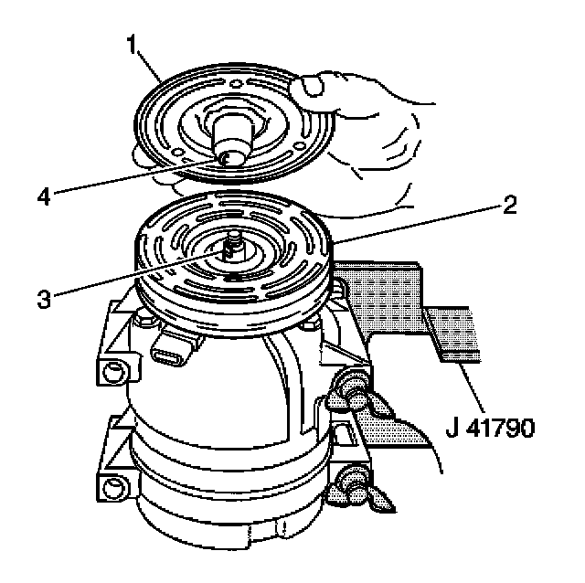 3. Align the shaft key with the shaft keyway in the clutch plate and the hub assembly and place onto the A/C compressor shaft (3).