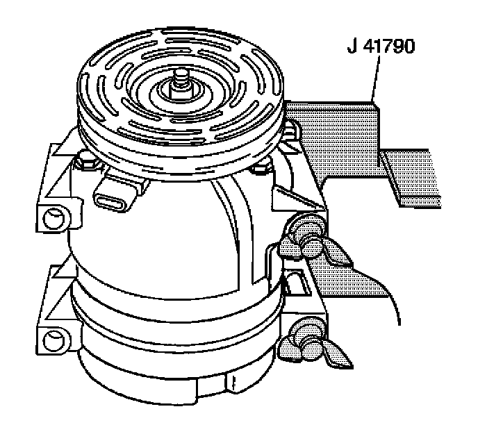 2. Clamp the A/C compressor holding fixture, J 41790 in a vise and attach the A/C compressor to the J 41790.