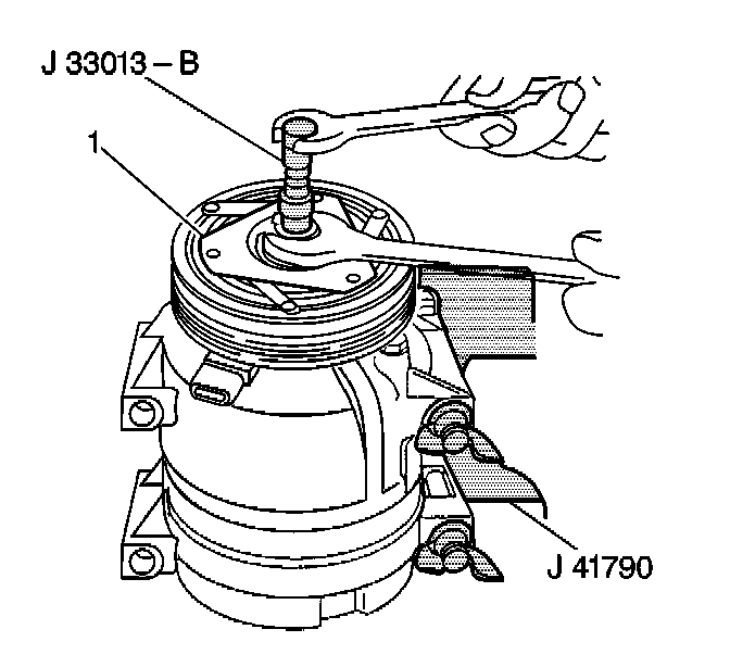6. Remove the hub and drive plate assembly (1) by turning the center screw into the body of the J 33013-B and against the A/C compressor shaft.
