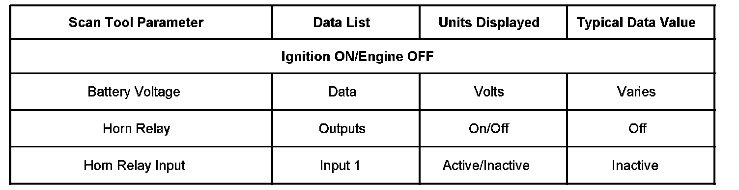 The Horns Scan Tool Data List contains all of the horn related parameters that are available on the scan tool. The parameters in the list are arranged in alphabetical order. The column, "Data List," indicates the location of the parameter within the scan tool menu selections. Use the Horns Scan Tool Data List as directed by a diagnostic table or in order to supplement the diagnostic procedures. Begin all of the diagnostic procedures with Diagnostic System Check - Horns.