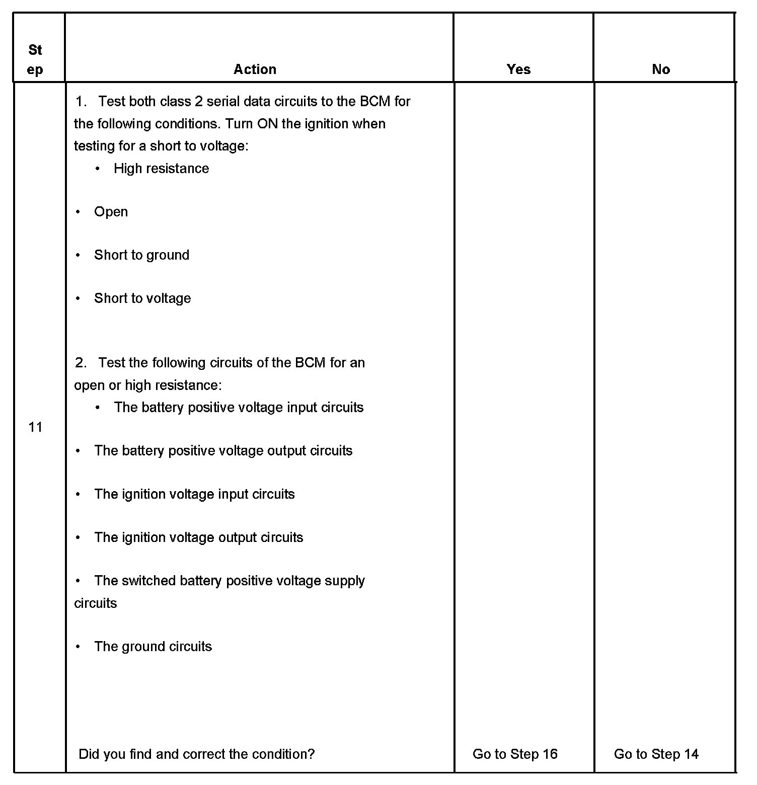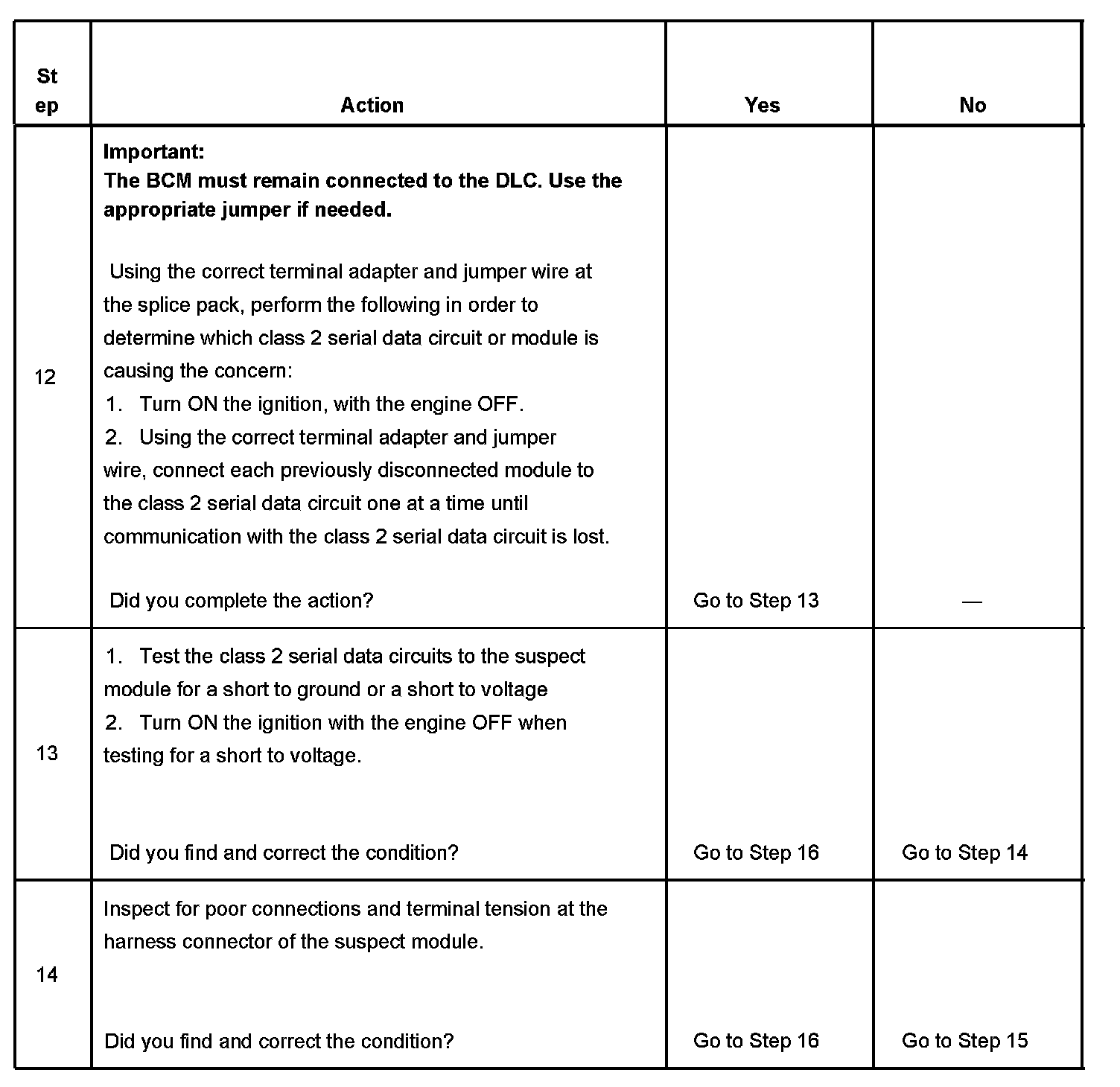 12. Normal class 2 serial data communication cannot take place until the body control module (BCM) sends the appropriate power mode message. If the BCM does not send a wake-up message, other modules on the class 2 serial data circuit may not communicate.