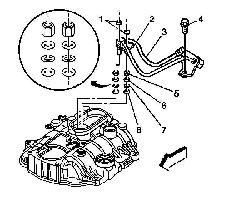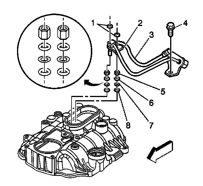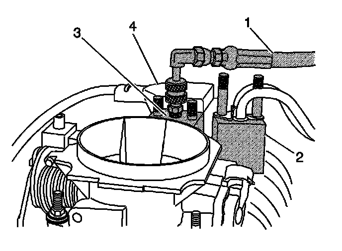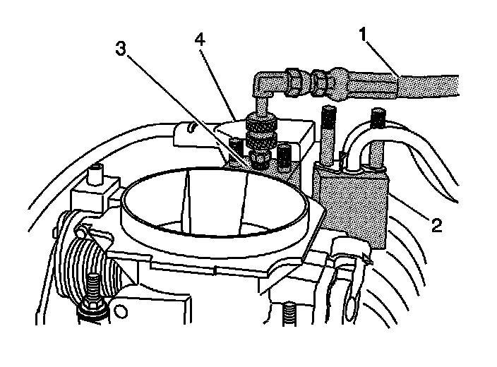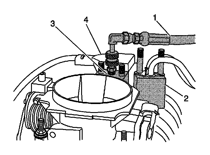 7. Remove the fuel line bolt (4) at the rear of intake manifold.
