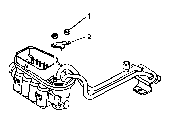 9. Remove the nuts (1) and clamp (2) from the fuel pipe.
