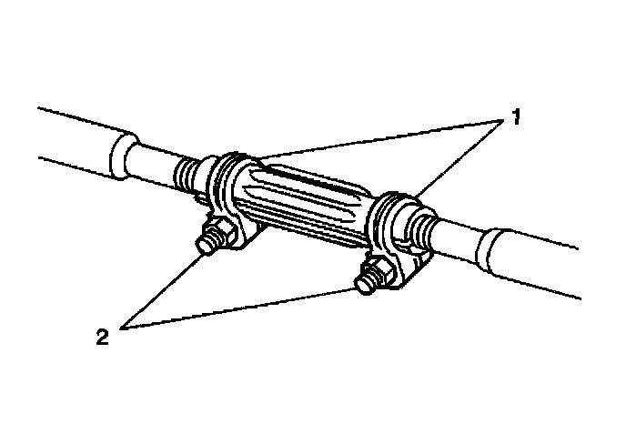 10. Position the two clamps (2) between the locating dimples (1) at either end of the adjuster tube.