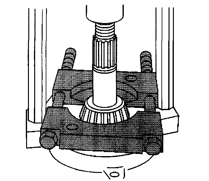 29. Remove the inner pinion bearing by installing the J22912-01 between the pinion bearing and the pinion gear and pressing the bearing off the pinion.