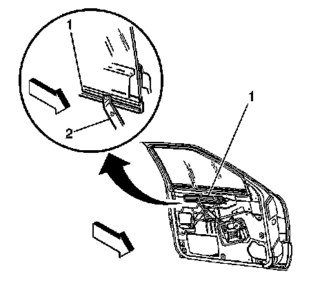 3. Pull the window upward in order to release the sash channel from the front regulator roller (2).