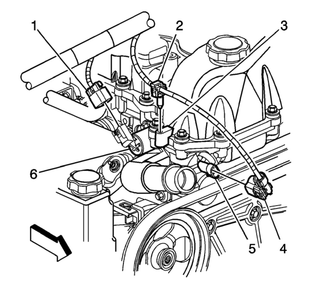 1. Disconnect the engine wiring harness electrical connector (1) from the camshaft position (CMP) actuator solenoid valve (6).