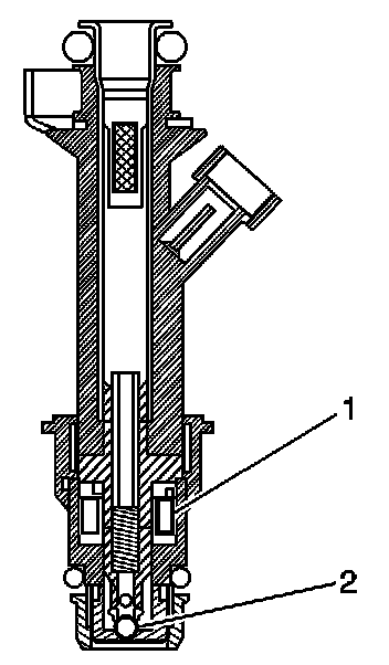 The Multec 2 fuel injector assembly is a solenoid device controlled by the control module that meters pressurized fuel to a single engine cylinder. The control module energizes the high-impedance, 12 ohms, injector solenoid (2) to open a normally closed ball valve (3). This allows fuel to flow into the top of the injector, past the ball valve, and through a director plate at the injector outlet. The director plate has four machined holes that control the fuel flow, generating a spray of finely atomized fuel at the injector tip. Fuel from the injector tip is directed at the intake valve, causing the fuel to become further atomized and vaporized before entering the combustion chamber. This fine atomization improves fuel economy and emissions.