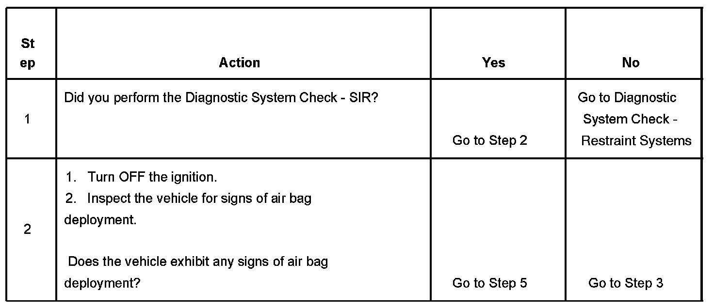 The inflatable restraint sensing and diagnostic module (SDM) contains a sensing device that converts changes in vehicle velocity to an electrical signal. The SDM compares this signal to a value stored in memory. When the generated signal exceeds the stored value, the SDM performs additional signal processing and compares the generated signals to values stored in memory. When two of the generated signals exceed the stored values, the SDM will cause current to flow through the inflator modules, deploying the air bags. DTC B0053 will set instead of DTC B0051 when a deployment occurs while an inflator circuit fault is present that may result in a non-deployment situation in one or more of the inflator modules.