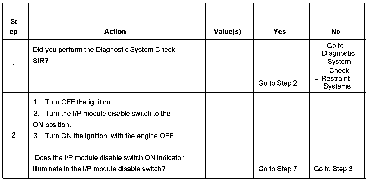 The inflatable restraint I/P module disable switch circuit consists of an I/P module disable switch, I/P module disable switch indicator, I/P module disable switch signal circuit, and I/P module suppression indicator control circuit. When the ignition is turned ON, the inflatable restraint sensing and diagnostic module (SDM) performs tests to diagnose critical malfunctions within itself. The SDM monitors the voltage levels at the I/P module disable switch signal and the I/P module suppression indicator control circuits of the SDM to determine the position of the I/P module disable switch. If a malfunction is detected, a DTC will be stored.