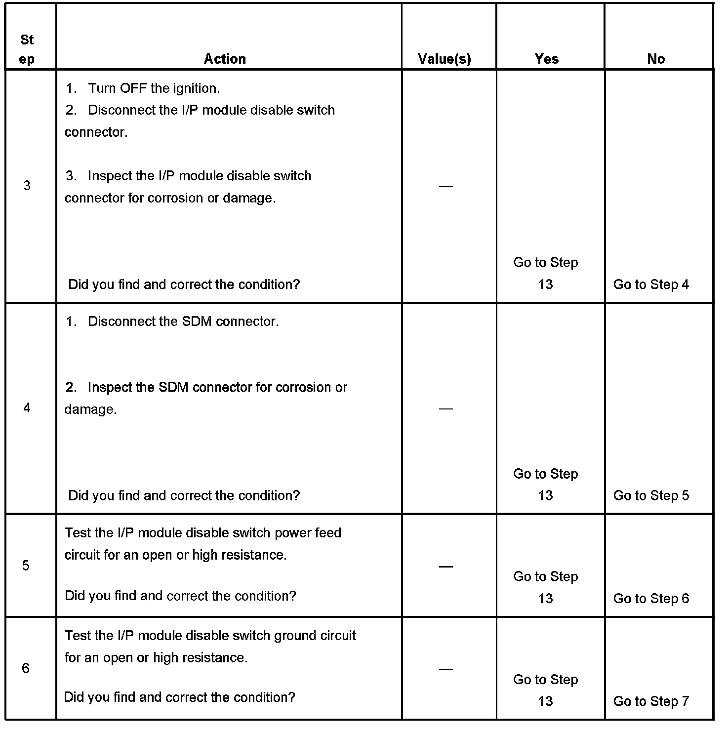 6. Tests for an open or high resistance in the I/P module disable switch ground circuit.