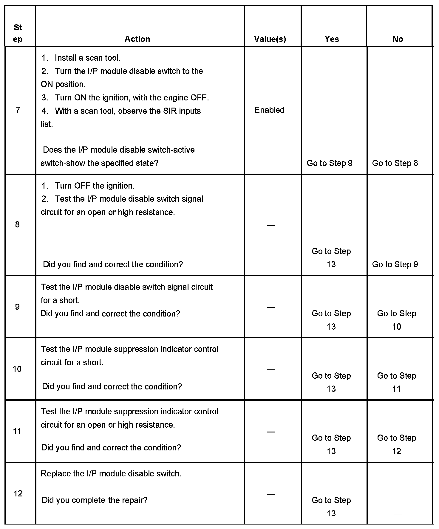 9. Tests for a short in the I/P module disable switch signal circuit.