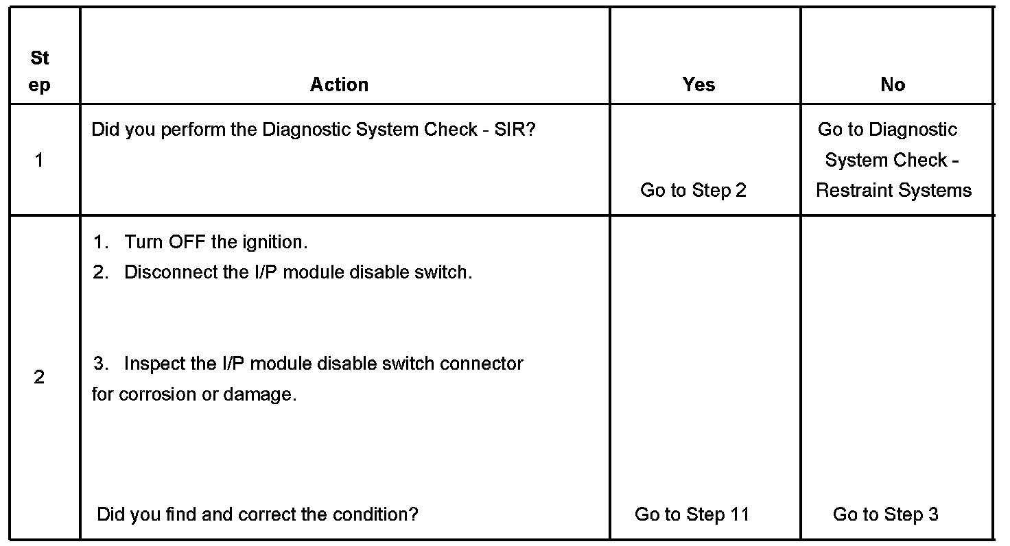 The inflatable restraint I/P module disable switch circuit consists of an I/P module disable switch, I/P module disable switch indicator, I/P module disable switch signal circuit, and I/P module suppression indicator control circuit. When the ignition is turned ON, the inflatable restraint sensing and diagnostic module (SDM) performs tests to diagnose critical malfunctions within itself. The SDM monitors the voltage levels at the I/P module disable switch signal and the I/P module suppression indicator control circuits of the SDM to determine the position of the I/P module disable switch. If a malfunction is detected, a DTC will be stored.