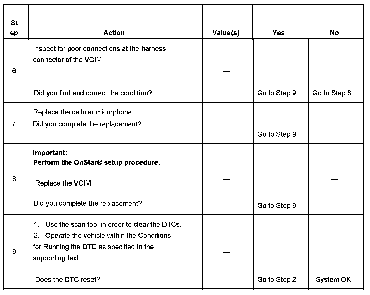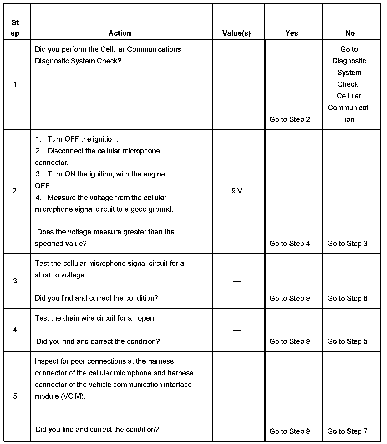 - The VCIM detects an open in the cellular microphone low reference circuit or a short to voltage in the cellular microphone signal circuit.