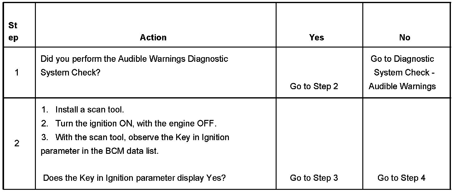 The body control module (BCM) monitors the ignition key alarm switch. When the key is in the ignition, the ignition key alarm switch is closed and the signal circuit is low. When the key is not in the ignition, the ignition key alarm switch is open and the signal circuit is high.