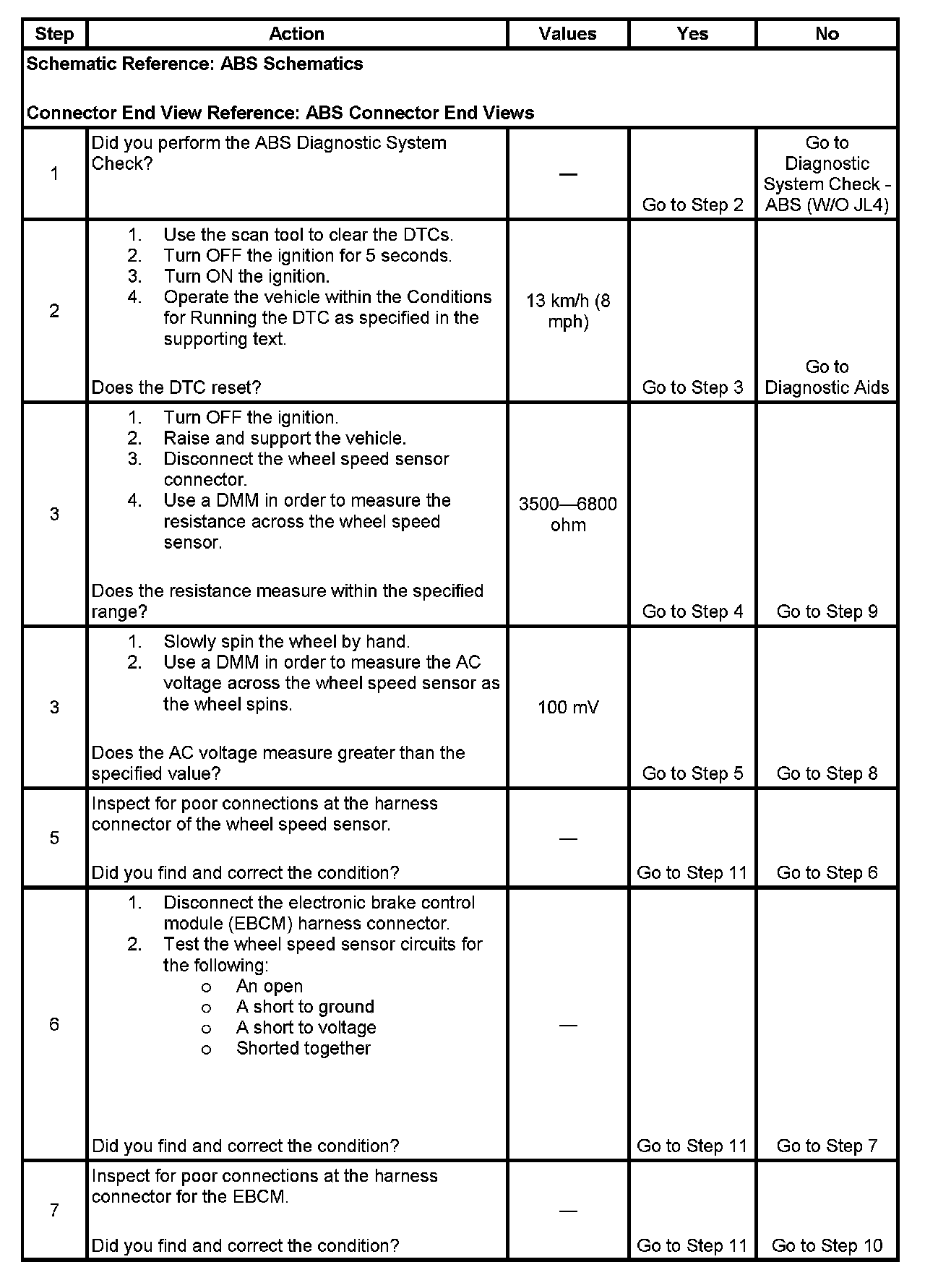 ^ The EBCM detects the absence of a wheel speed sensor signal for 5 seconds. If more than one absent wheel speed sensor signal is detected, the condition must be present for 120 seconds to set DTCs.