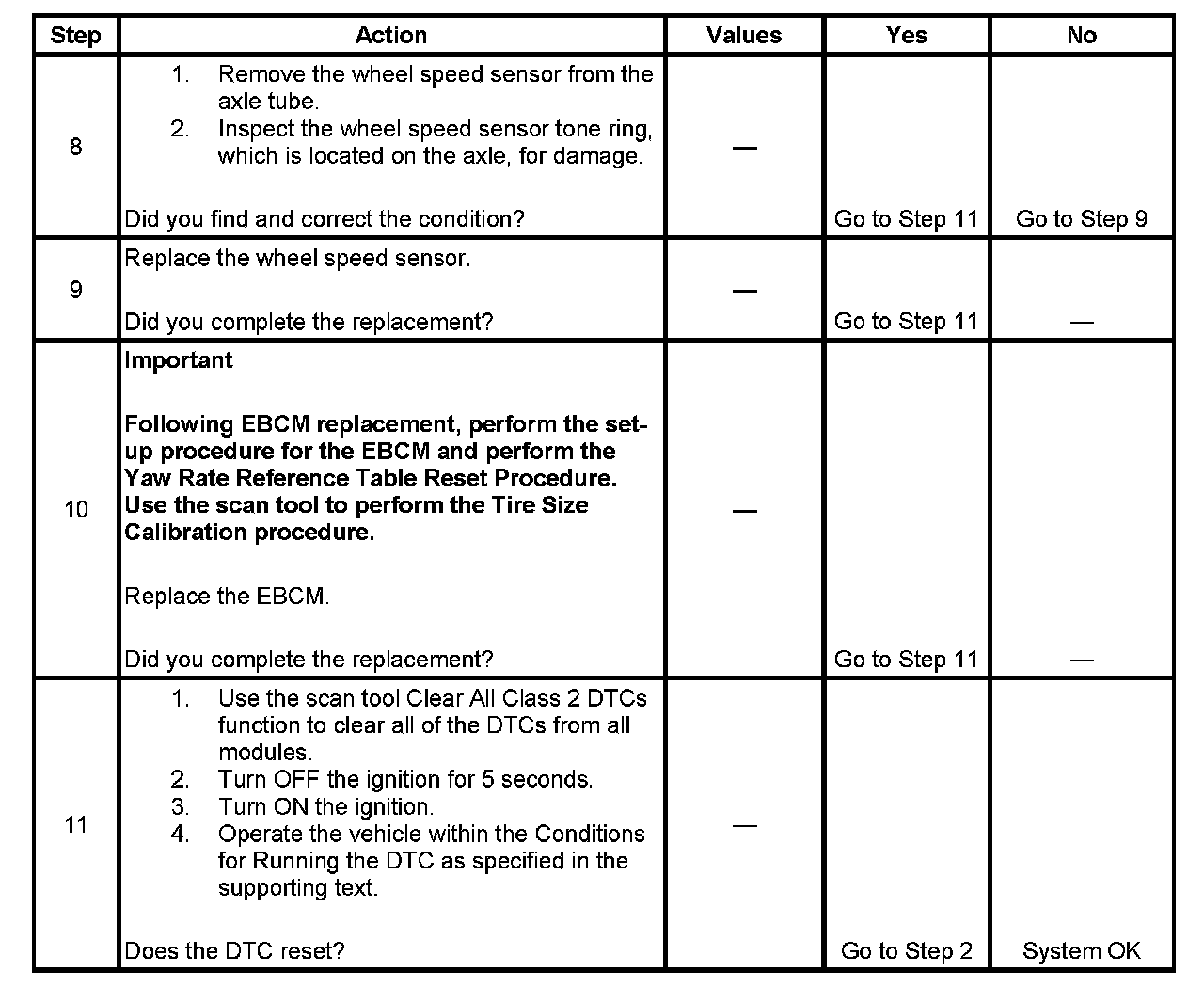 ^ The EBCM disables the ABS/TCS/VSES and may disable the DRP if more than one wheel speed sensor DTC is set.