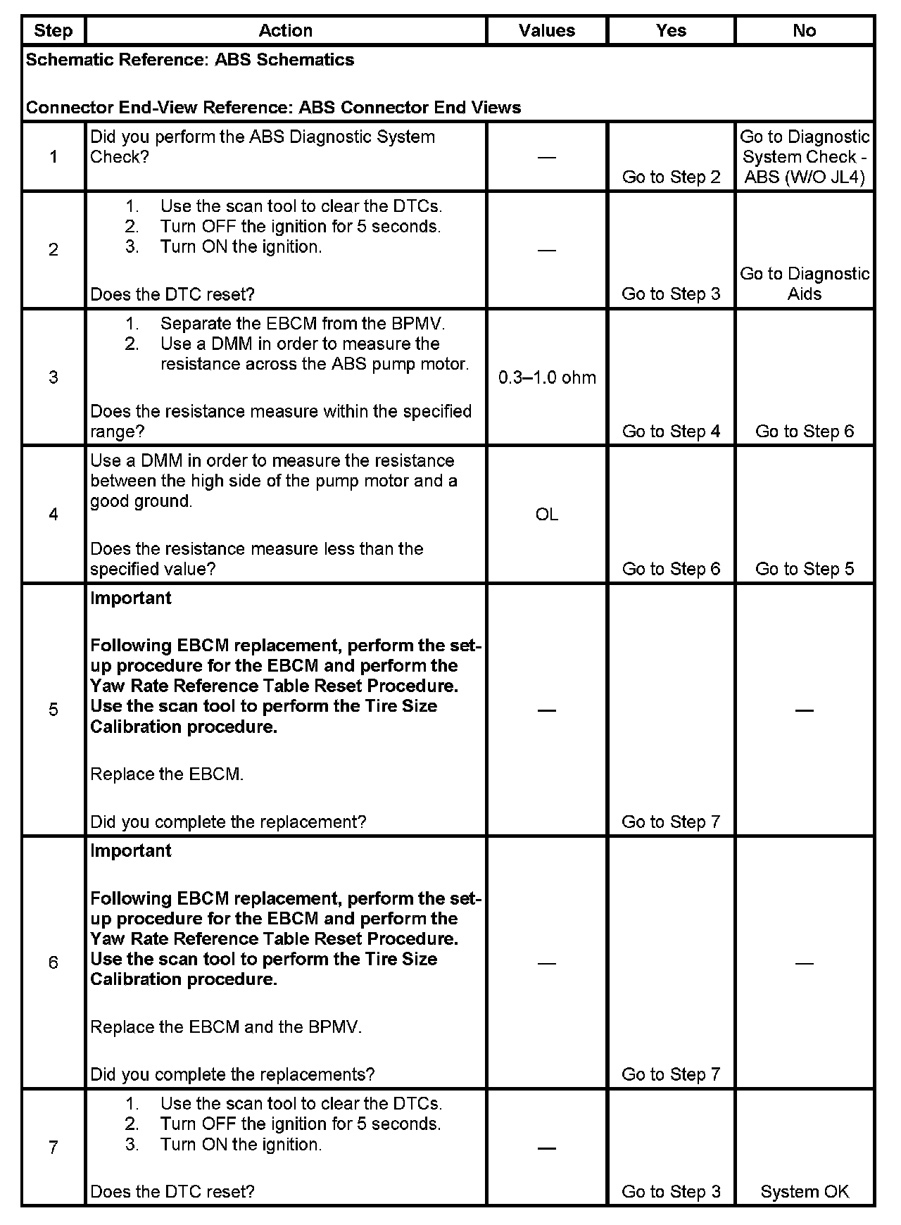3. A shorted ABS pump motor may damage the contacts within the system relay. It is imperative that the steps in the table be followed to prevent damage to a replacement EBCM.
