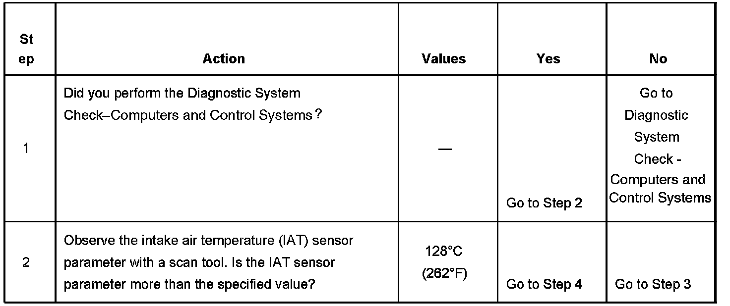 The PCM detects that the IAT Sensor parameter is more than 128°C (262°F) for 5 seconds.