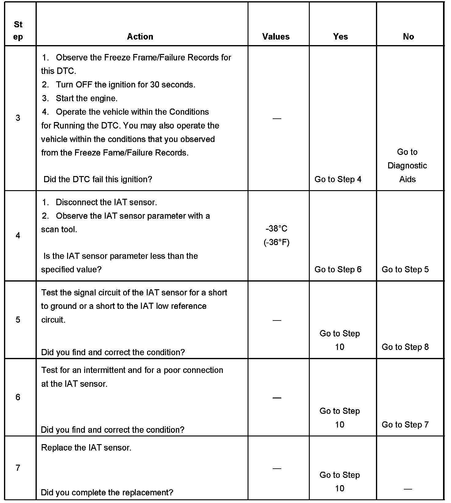 The intake air temperature (IAT) sensor is a variable resistor. The IAT sensor has a signal circuit and a low reference circuit. The IAT sensor measures the temperature of the air entering the engine. The powertrain control module (PCM) supplies 5 volts to the IAT signal circuit and a ground for the IAT low reference circuit. When the IAT sensor is cold, the sensor resistance is high. When the air temperature increases, the sensor resistance decreases. With high sensor resistance, the PCM detects a high voltage on the IAT signal circuit. With lower sensor resistance, the PCM detects a lower voltage on the IAT signal circuit. If the PCM detects an excessively low IAT signal voltage, indicating a high temperature, DTC P0112 sets.