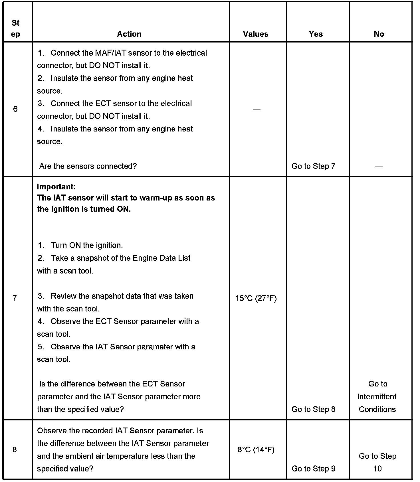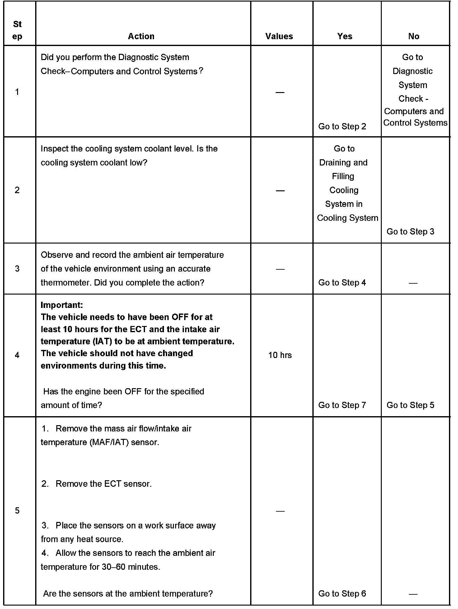 - DTCs P0112, P0113, P0117, P0118, P0125, P0128, P0601, P0602, P1621, P2610 are not set.