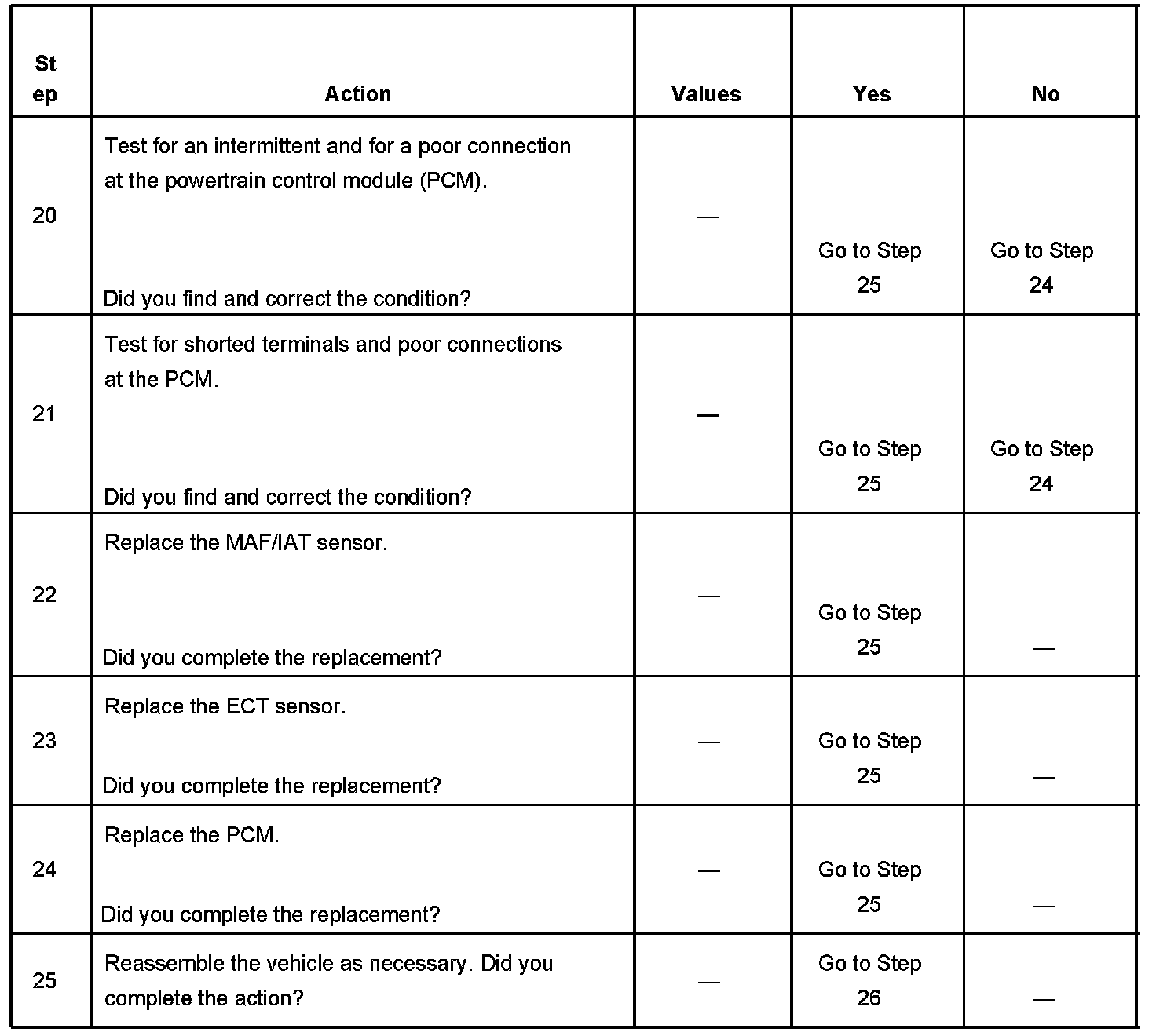The numbers below refer to the step numbers on the diagnostic table.