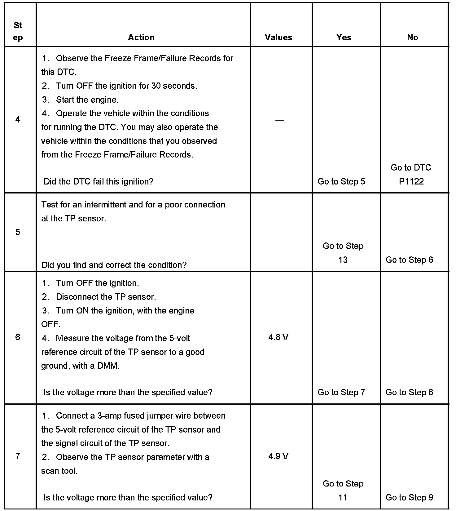 The PCM provides the TP sensor with 5 volts on the 5-volt reference circuit and a ground on the low reference circuit. Rotation of the TP sensor rotor from the closed throttle position to the wide open throttle (WOT) position provides the PCM with a signal voltage from less than 1 volt to more than 4 volts through the TP sensor signal circuit. If the PCM detects an excessively low signal voltage, DTC P0122 sets.