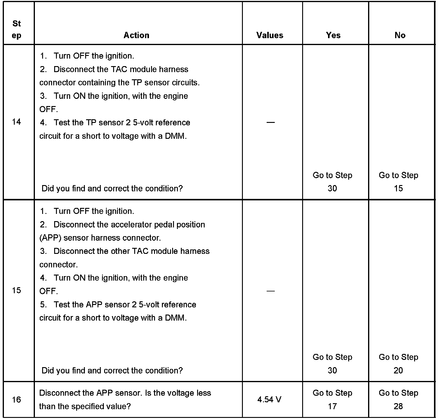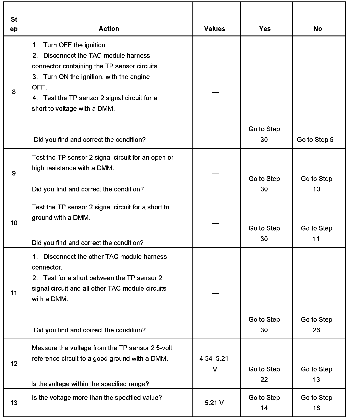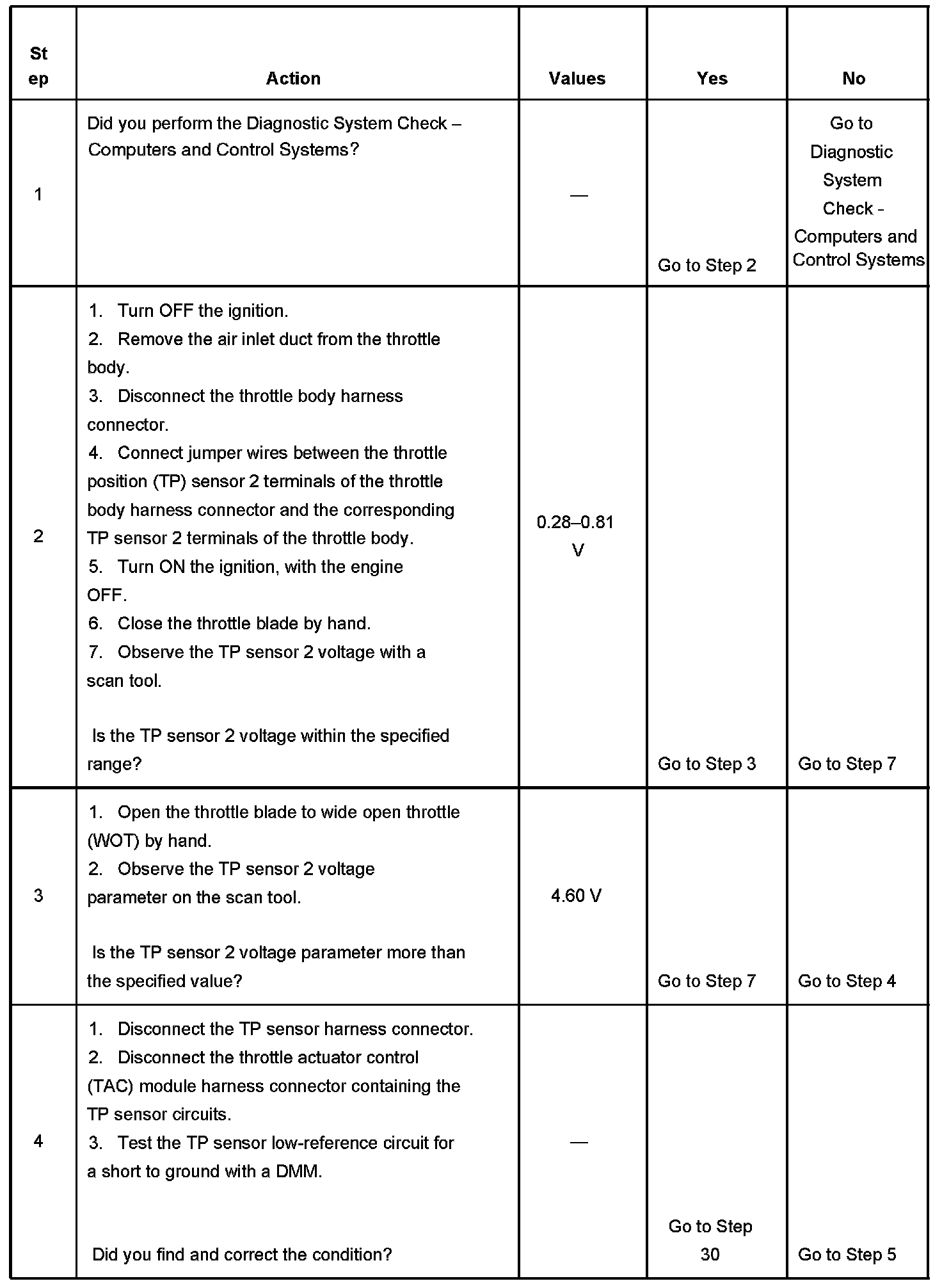 - The TP sensor 2 voltage is less than 0.28 volt or greater than 4.60 volts.