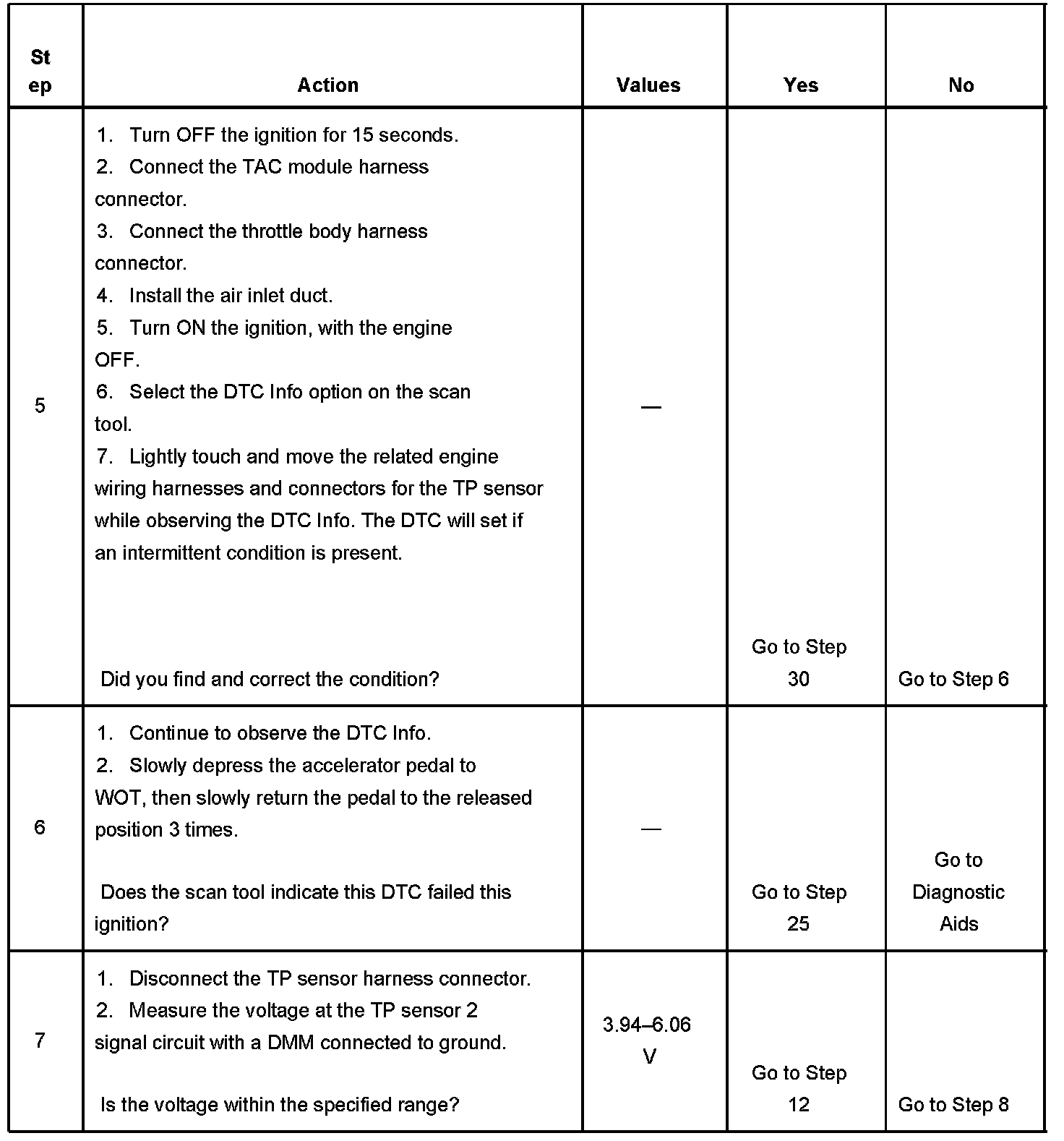 The TP sensor is used to determine the throttle plate angle for various engine management systems. The control module provides the TP sensor a 5-volt reference circuit and a low reference circuit. The TP sensor then provides the control module a signal voltage proportional to throttle plate movement. The TP sensor 1 signal voltage is low at closed throttle and increases as the throttle opens. When the control module detects that the TP sensor 2 signal or the TP sensor 5-volt reference voltage is outside the predetermined range, this DTC sets.