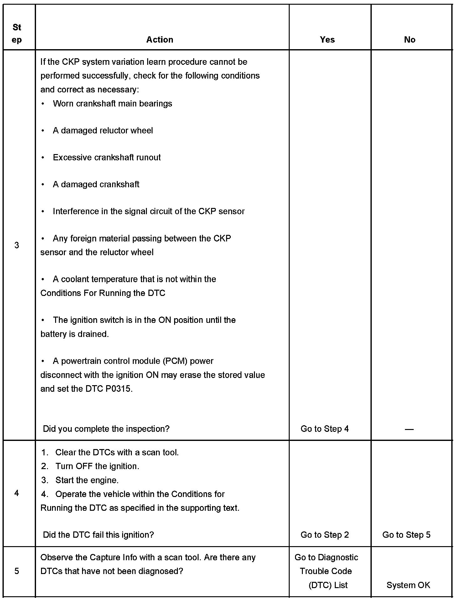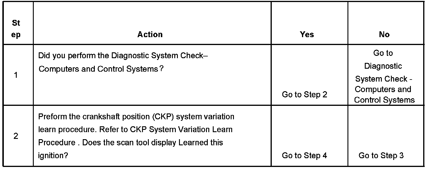 This enhances the ability of the PCM to detect misfire events over a wide range of engine speed and load. The PCM stores the Crankshaft Position System Variation values after a learn procedure has been performed. If the actual crankshaft position variation is not within the Crankshaft Position System Variation compensating values stored in the PCM, DTC P0300 may set. If the CKP system variation values are not stored in the PCM memory, DTC P0315 sets.