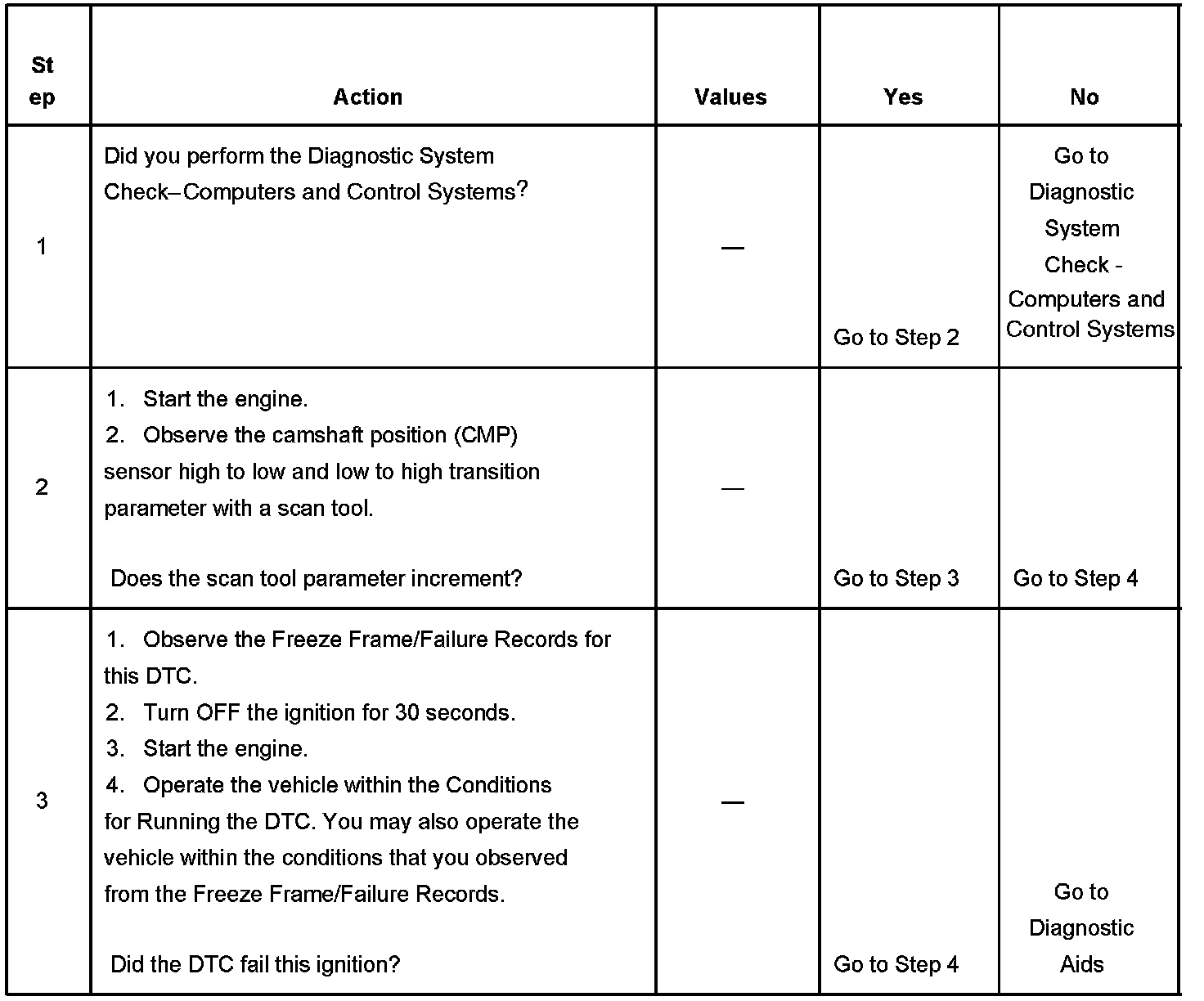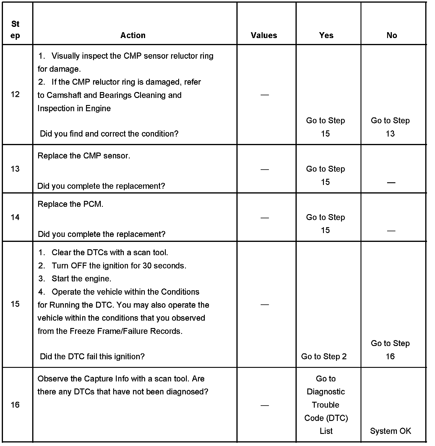 The CMP sensor 1 X signal is used by the PCM to determine if the cylinder at top dead center (TDC) is on the firing stroke or the exhaust stroke. The PCM can determine TDC for all cylinders by using the CKP sensor 24 X signal alone. The engine will start without a CMP signal as long as the PCM receives the CKP sensor 24 X signal. A slightly longer cranking time may be a symptom of this condition. The system attempts synchronization and looks for an increase in engine speed indicating that the engine started. If the PCM does not detect an increase in engine speed, the PCM assumes that the PCM incorrectly synchronized to the exhaust stroke and re-syncs to the opposite cam position. If the PCM detects that the CMP signal is constantly high, DTC P0343 sets.