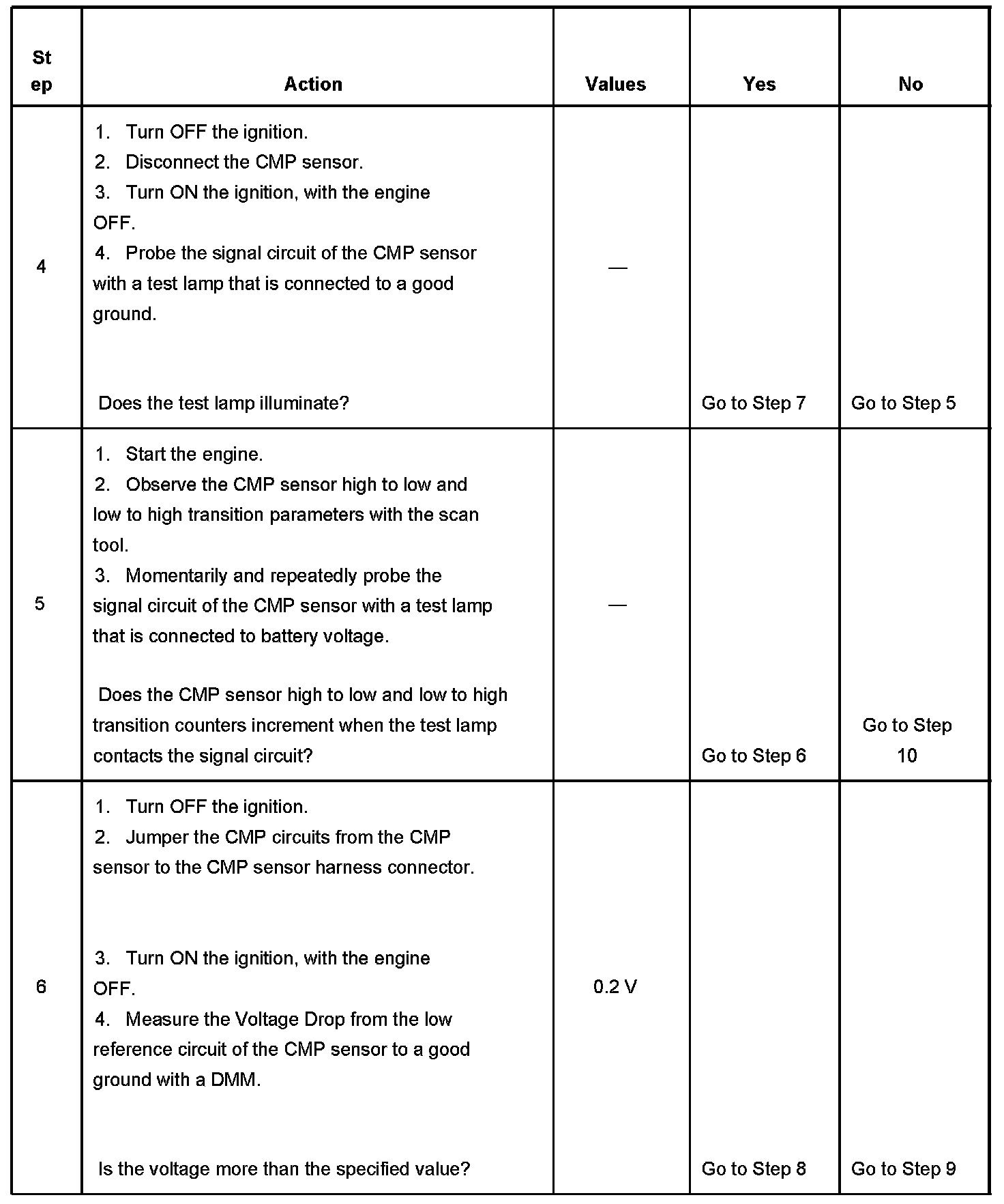 5. This step tests the CMP sensor signal circuit. Applying a voltage causes the CMP sensor high to low and low to high parameter to increase if the circuit and the PCM are operating properly.