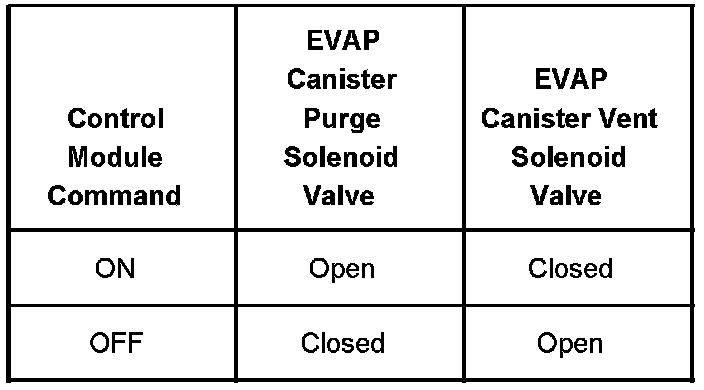 The table illustrates the relationship between the ON and OFF states, and the Open or Closed states of the EVAP canister purge and vent solenoid valves.