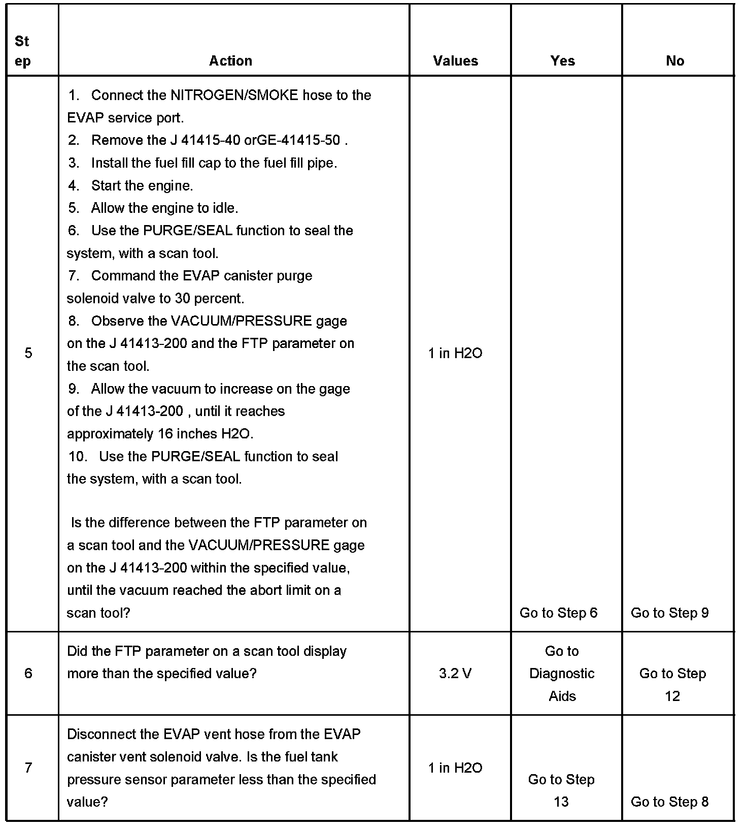 This DTC tests the evaporative emission (EVAP) system for a restricted or blocked EVAP vent path. The control module commands the EVAP canister purge solenoid valve Open and the EVAP canister vent solenoid valve Closed. This allows vacuum to be applied to the EVAP system. Once a calibrated vacuum level has been reached, the control module commands the EVAP canister purge solenoid valve Closed and the EVAP canister purge solenoid valve Open. The control module monitors the fuel tank pressure (FTP) sensor for a decrease in vacuum. If the vacuum does not decrease to near 0 inches H2O in a calibrated time, this DTC sets.