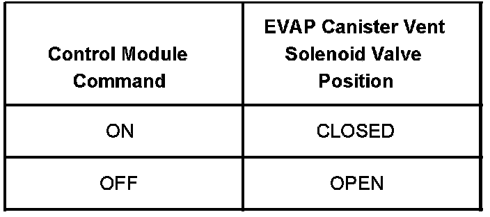 The table illustrates the relationship between the ON and OFF states, and the OPEN or CLOSED states of the EVAP canister vent solenoid valve.