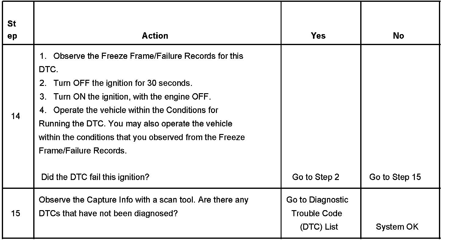 - The control module records the operating conditions at the time the diagnostic fails. The first time the diagnostic fails, the control module stores this information in the Failure Records. If the diagnostic reports a failure on the second consecutive ignition cycle, the control module records the operating conditions at the time of the failure. The control module writes the operating conditions to the Freeze Frame and updates the Failure Records.