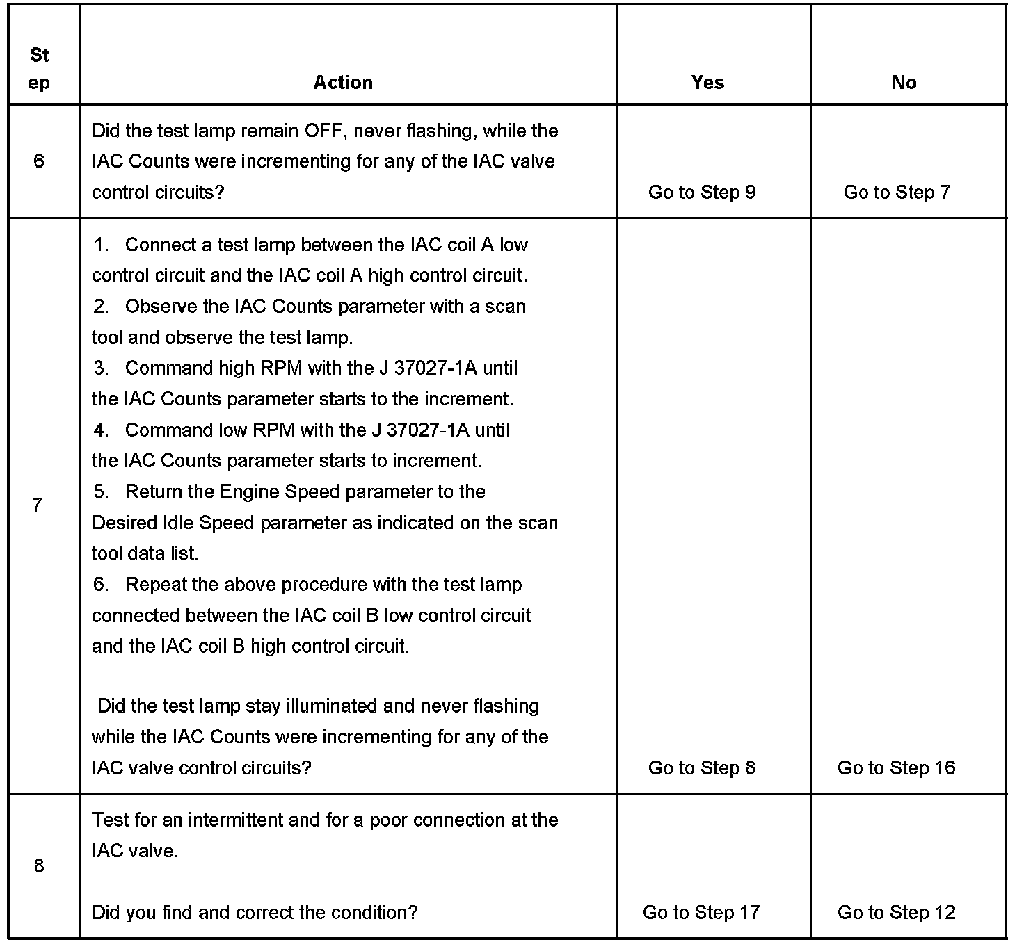 7. This test will determine the ability of the PCM to provide the IAC valve control circuits with a ground. On a normally operating system, the test lamp should not flash while the IAC Counts are incrementing.