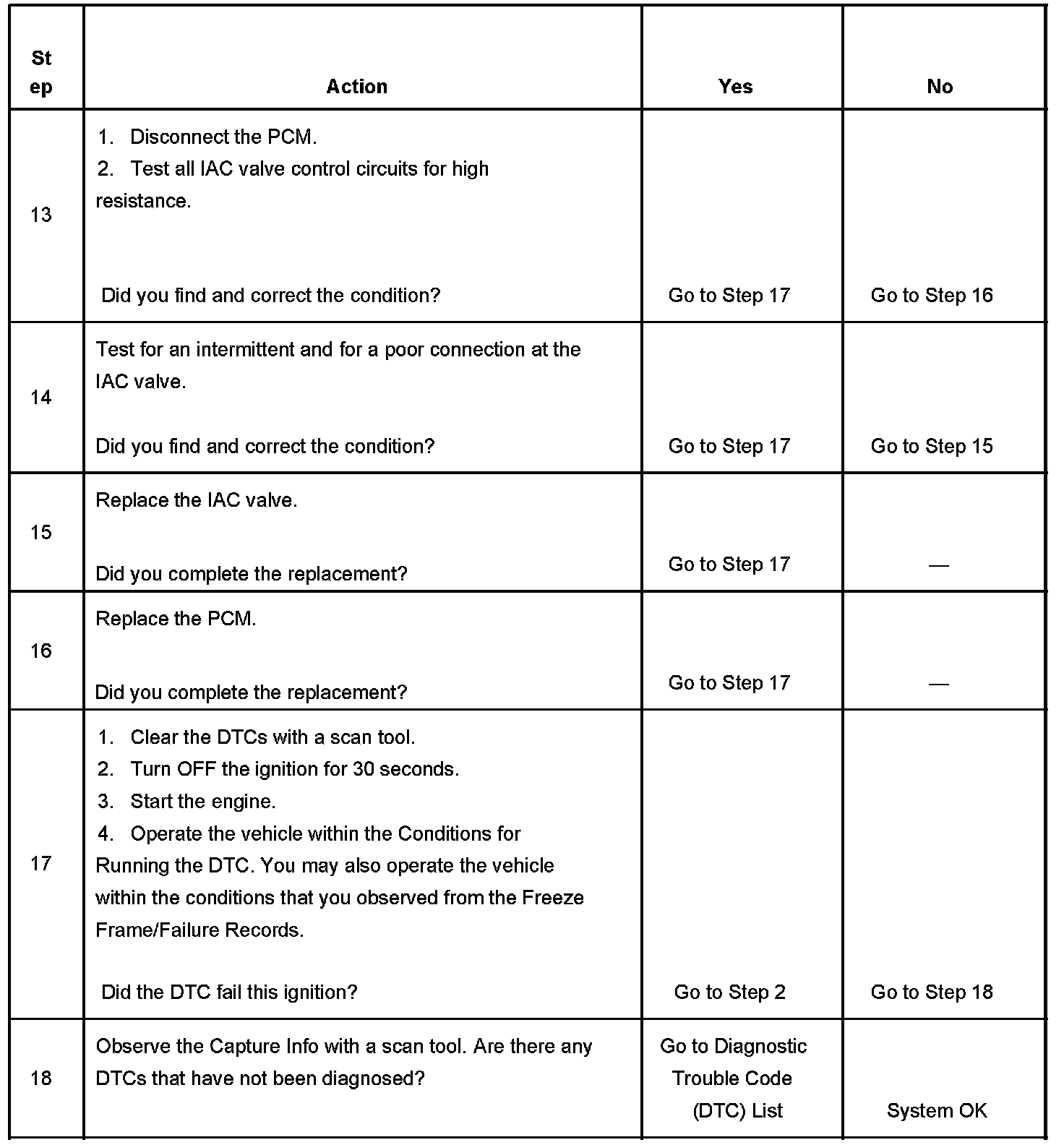 The IAC counts will increment up or down as the PCM attempts to change the IAC valve pintle position. An IAC Reset will occur when the ignition key is turned OFF. First, the PCM will seat the IAC pintle in the idle air passage bore. Second, the PCM will retract the pintle a predetermined number of counts to allow for efficient engine start-up. If the engine idle speed is out of range for a calibrated period of time, an idle speed diagnostic trouble code (DTC) sets.