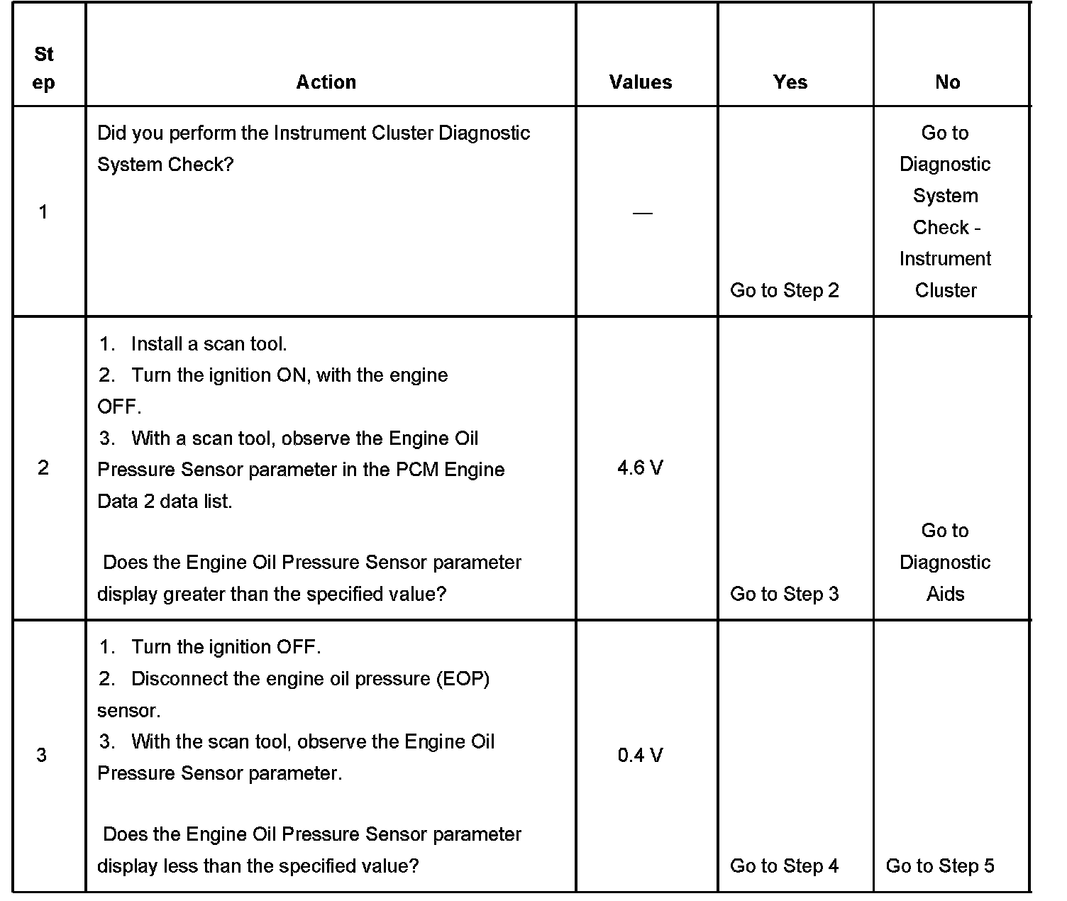 The engine oil pressure (EOP) sensor changes resistance based on engine oil pressure. The powertrain control module (PCM) monitors the signal circuit of the EOP sensor. When the engine oil pressure is high, the sensor resistance is high and the PCM senses a high signal voltage. When the engine oil pressure is low, the sensor resistance is low and the PCM senses a low signal voltage. The PCM sends the engine oil pressure information to the instrument panel cluster (IPC) via the class 2 serial data circuit.