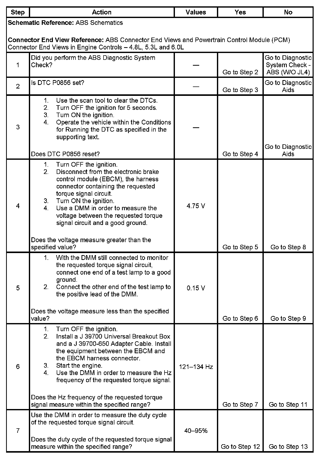 The PCM supplies 5 volts through an internal resistor, to the EBCM on the requested torque signal circuit. The EBCM toggles this voltage to ground to create the requested torque signal.