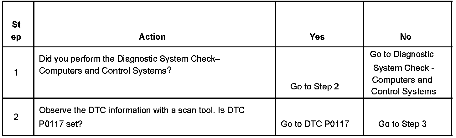 The engine coolant temperature (ECT) sensor is a variable resistor, that measures the temperature of the engine coolant. The powertrain control module (PCM) supplies 5 volts to the ECT signal circuit and a ground for the ECT low reference circuit. When the ECT is cold, the sensor resistance is high. When the ECT increases, the sensor resistance decreases. With high sensor resistance, the PCM detects a high voltage on the ECT signal circuit. With lower sensor resistance, the PCM detects a lower voltage on the ECT signal circuit. If the PCM detects an excessively low ECT signal voltage, which is a high temperature indication, DTC P1114 sets.