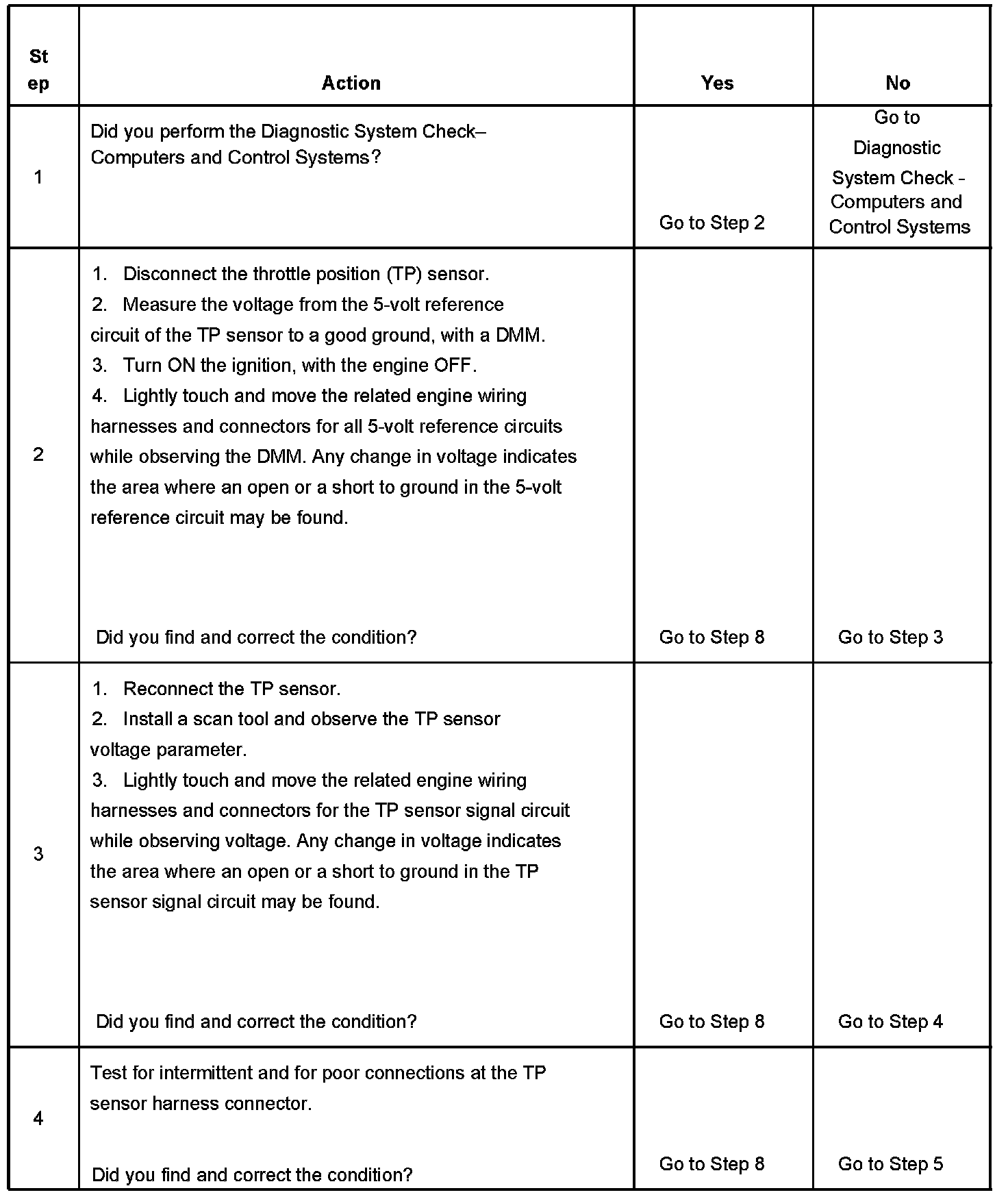 The PCM provides the TP sensor with 5 volts on the 5-volt reference circuit and a ground on the low reference circuit. Rotation of the TP sensor rotor from the closed throttle position to the wide open throttle (WOT) position provides the PCM with a signal voltage from below 1.0 volt to greater than 4.0 volts through the TP sensor signal circuit. If the PCM detects an intermittent excessively low signal voltage, DTC P1122 sets.