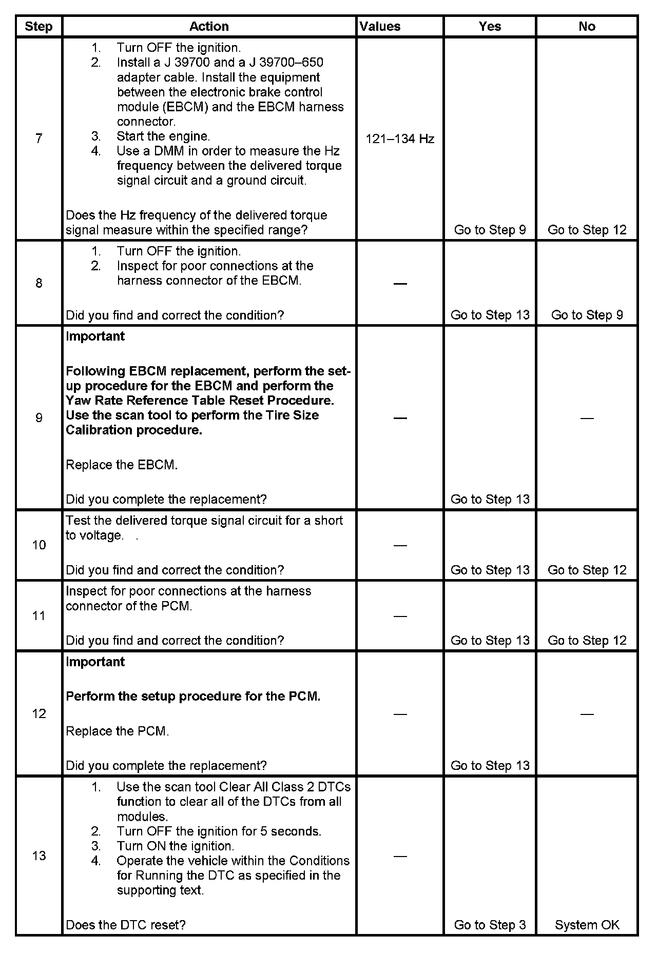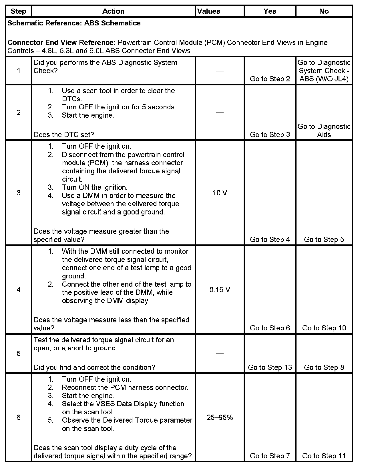 The electronic brake control module (EBCM) supplies approximately 12 volts through an internal resistor to the powertrain control module (PCM) on the delivered torque signal circuit. The PCM toggles this voltage to ground in order to create the delivered torque signal at the EBCM. A signal with a frequency of 128 Hz +/- 5 percent and a duty cycle of 25-95 percent is a valid delivered torque signal. The percentage of duty cycle is proportionate to the percentage of delivered engine torque.