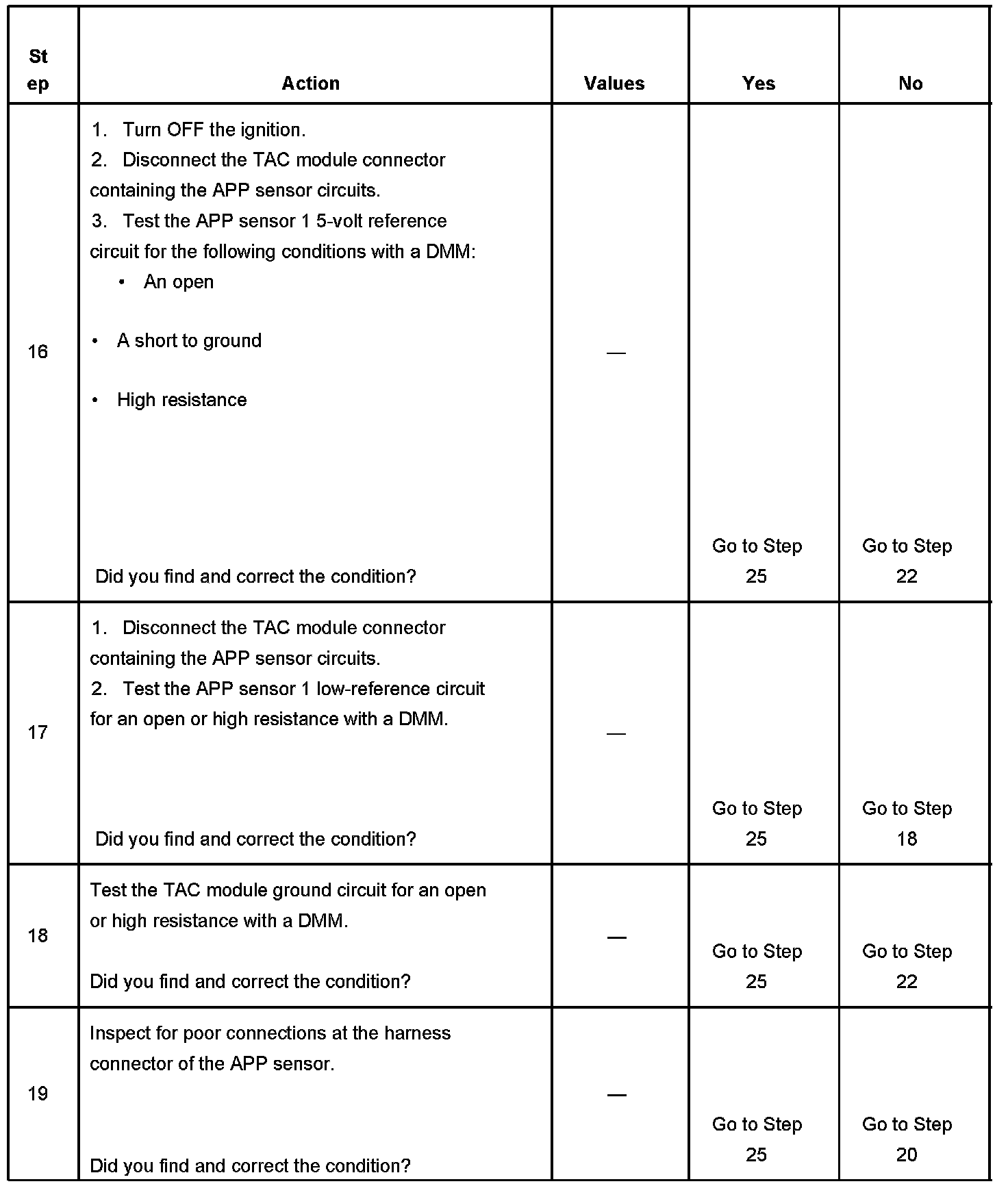 The control module provides the APP sensor a 5-volt reference circuit and a low reference circuit. The APP sensor then provides the control module a signal voltage proportional to pedal movement. The APP sensor 1 signal voltage is low at rest and increases as the pedal is depressed. When the control module detects that the APP sensor 1 signal or APP sensor 5-volt reference voltage is outside the predetermined range, this DTC sets.