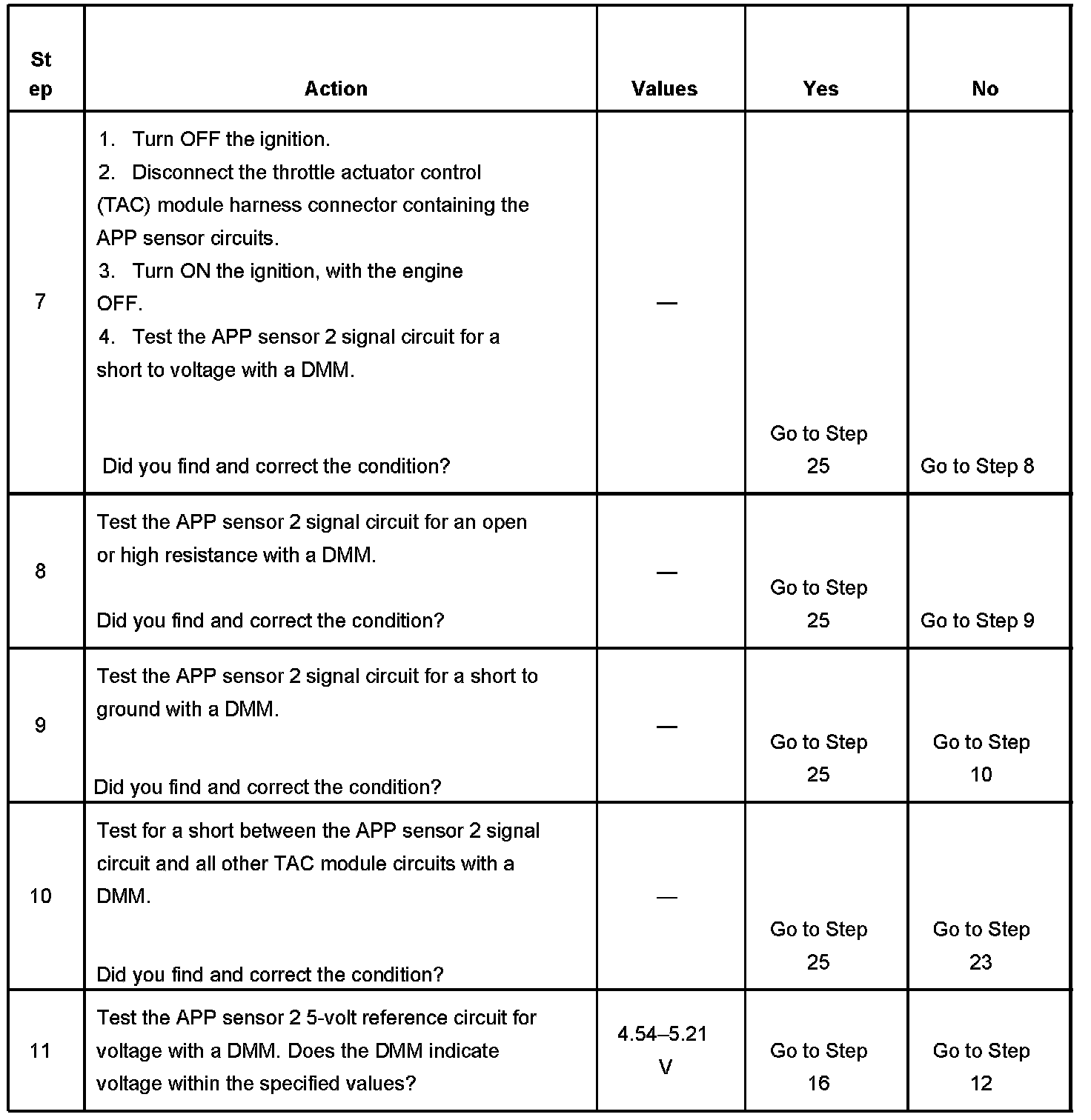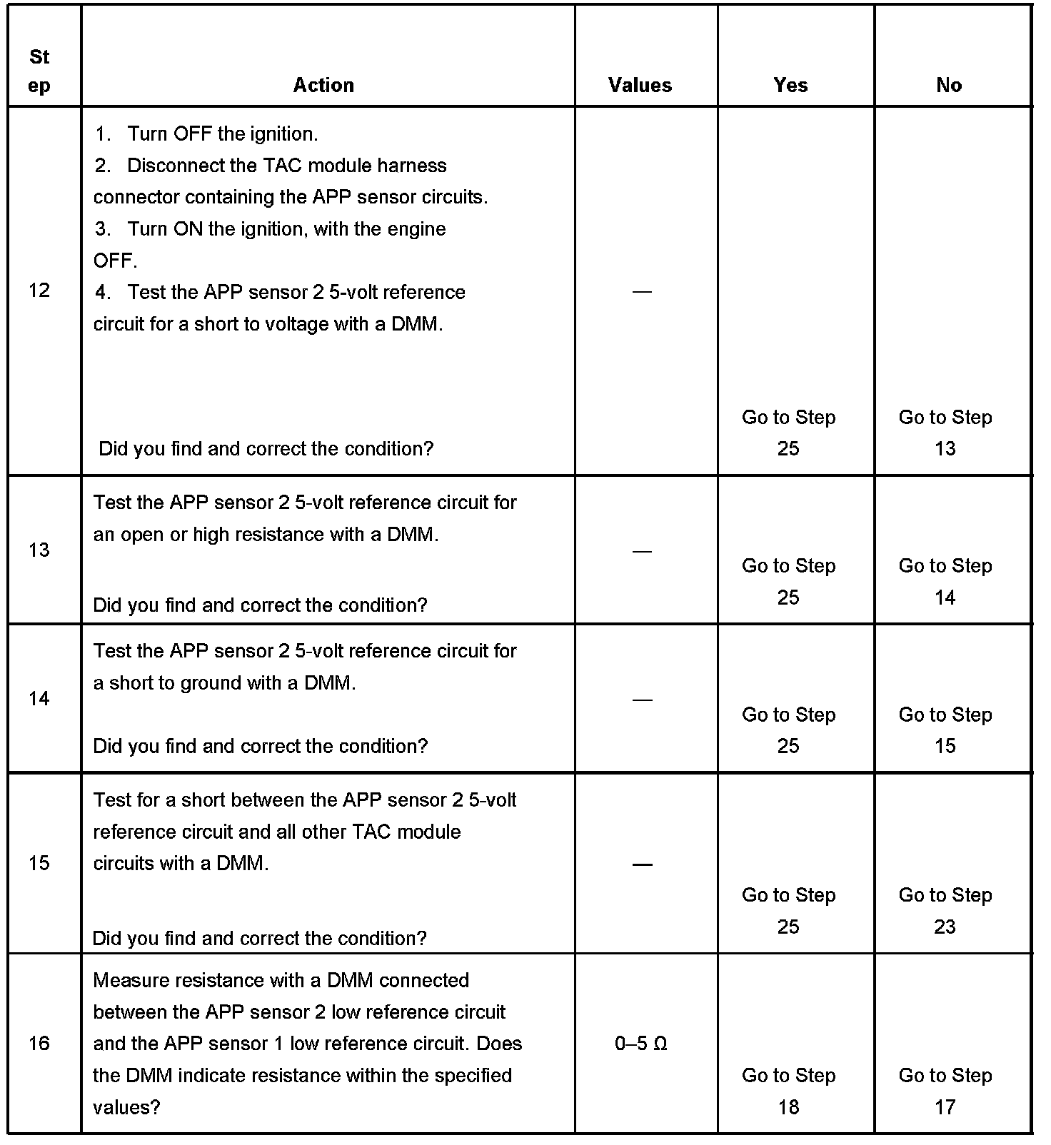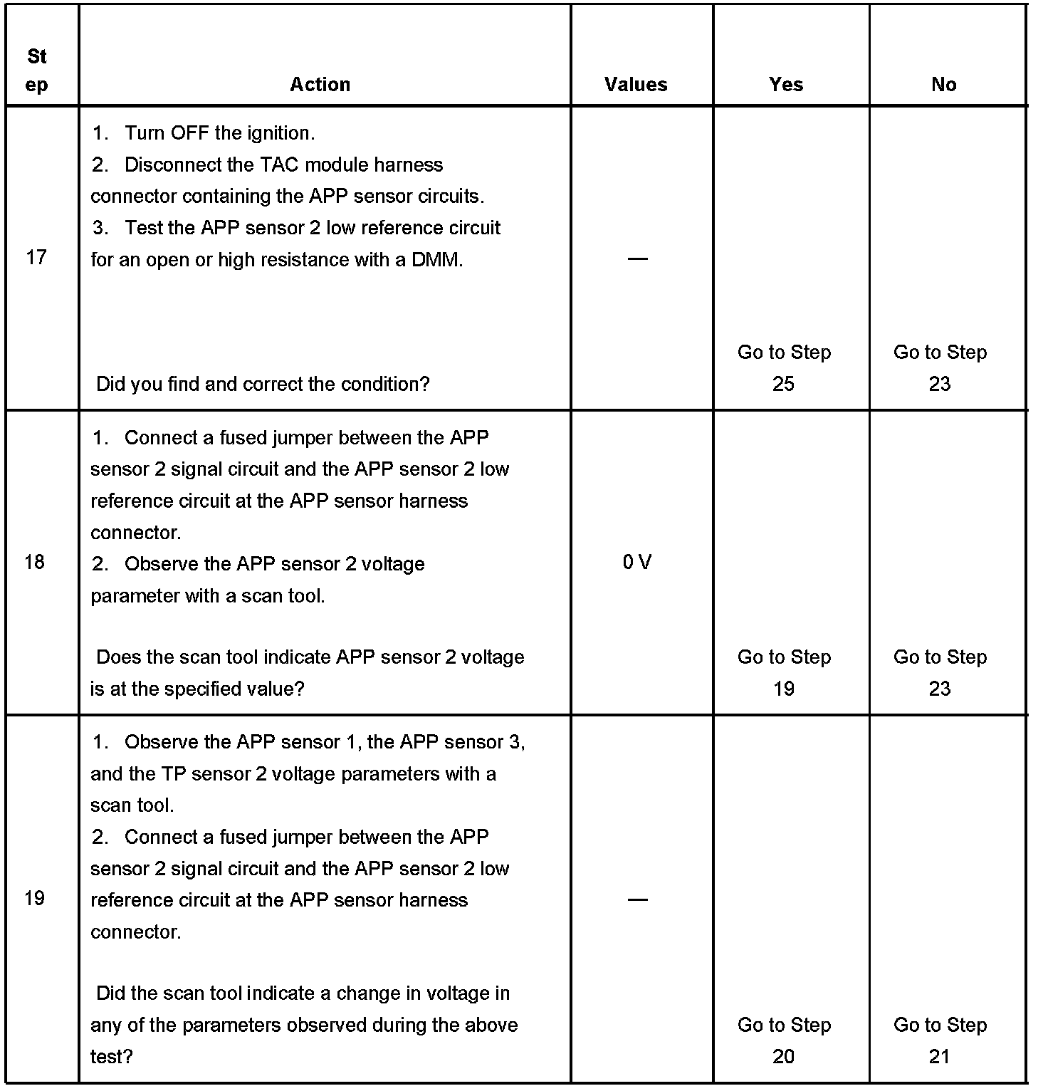 19. There are 2 separate 5-volt reference sources within the TAC module. The TP sensor 1 and the APP sensor 1 share one 5-volt reference source. The TP sensor 2 and the APP sensor 2 share another common 5-volt reference source. This test determines whether the signal circuit is shorted to any one of the 5-volt reference circuits. If a short exists, the corresponding sensor voltage will be pulled low.