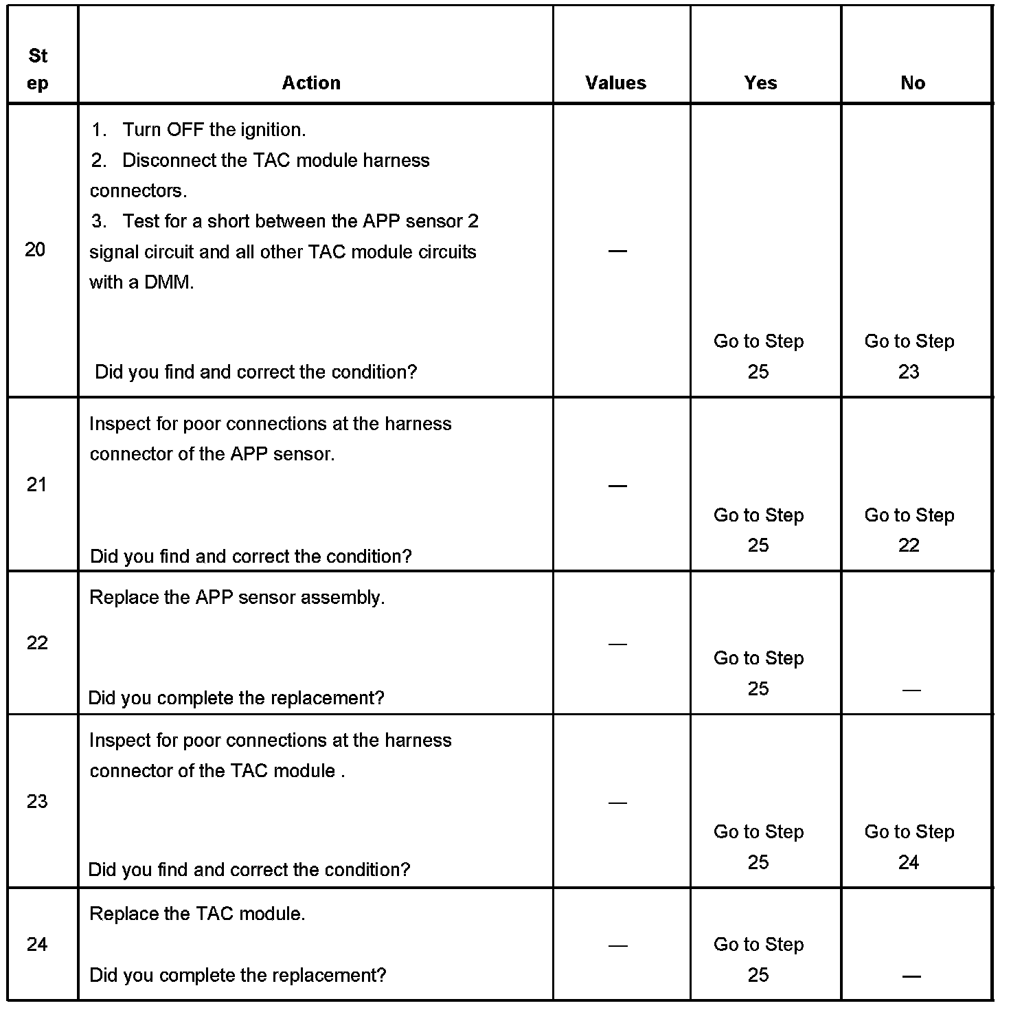 20. The previous step found the signal circuit and a 5-volt reference circuit shorted together. This test isolates whether the short is in the harness or within the TAC module.