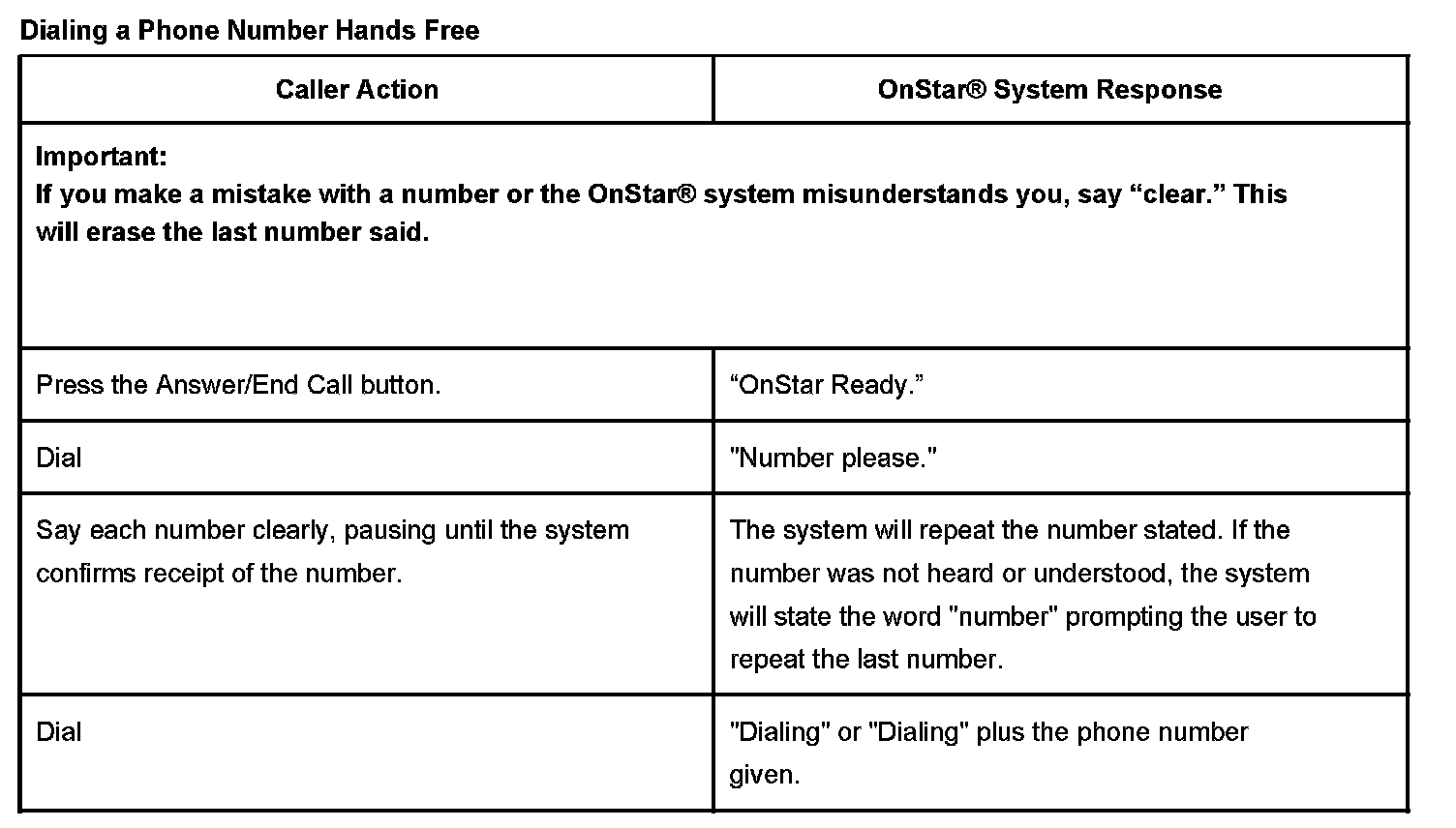 During a hands free call, the microphone and audio system operate the same way as a standard OnStar(R) call. When the answer/end call button is pressed, the audio system will mute; the OnStar(R) system will then return the prompt "OnStar Ready." At this point there are specific commands set to initiate a cellular call. If the vehicle receives a call when the radio is ON, the audio system will mute and an audible ring will be heard though the speakers. The call will be answered when the answer/end call button is pressed.